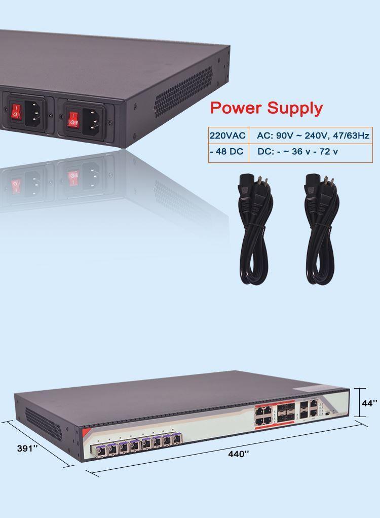 8 puertos PON (OLT-G08P)/16 puertos PON (OLT-G16P), 4 puertos GE SFP, 4 puertos GE COMBO, 2 puertos 10GE SFP+ Diseño de redundanciaFuente de alimentación dual