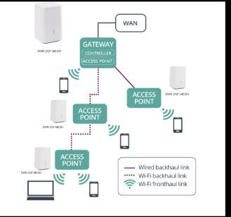 Der 1GE+1FE+WIFI5 SWR-2GF-MESH Wireless Router bietet leistungsstarke drahtlose Konnektivität für kleine Büros und Heimanwendungen (SOHO) und unterstützt gleichzeitigen Dualbandbetrieb bei 2,4 GHz und 5 GHz mit einem kombinierten Durchsatz von 1,2 Gbit/s (300 Mbit/s bei 2,4 GHz und 867 Mbit/s bei 5 GHz). SWR-2GF-MESH unterstützt Wi-Fi EasyMesh, einen standardbasierten Ansatz für Wi-Fi-Netzwerke mit mehreren Zugriffspunkten (APs). Dadurch werden die Vorteile von benutzerfreundlichem, selbstanpassendem Wi-Fi mit der größeren Flexibilität bei der Geräteauswahl kombiniert, die interoperable Wi-Fi EasyMesh-Geräte bieten.