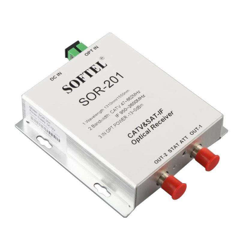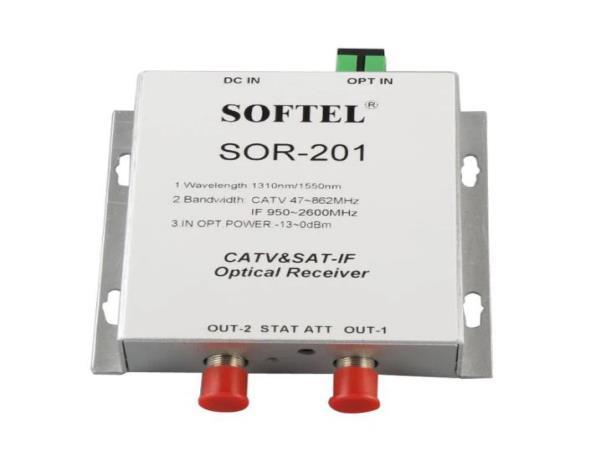 Receptor de satélite para TV SOR-201 é 47-862 MHz e 950-2600 MHz; Potência de entrada: -13~0 dBm; Comprimento de onda: 1310 nm/1550 nm.