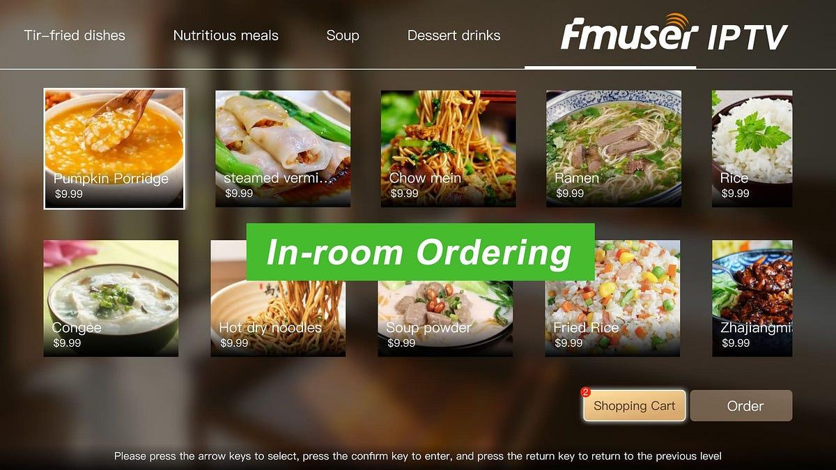 In-Room Food and Beverage Ordering: The IPTV system integrates an easy-to-use food and drink ordering feature, allowing guests to view menus and place orders directly from their TVs. This application eliminates the need for physical menus and helps streamline operations, ensuring quick service delivery and improved guest satisfaction.