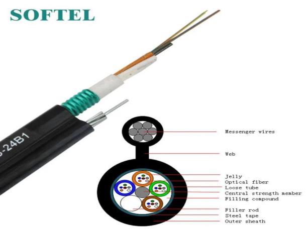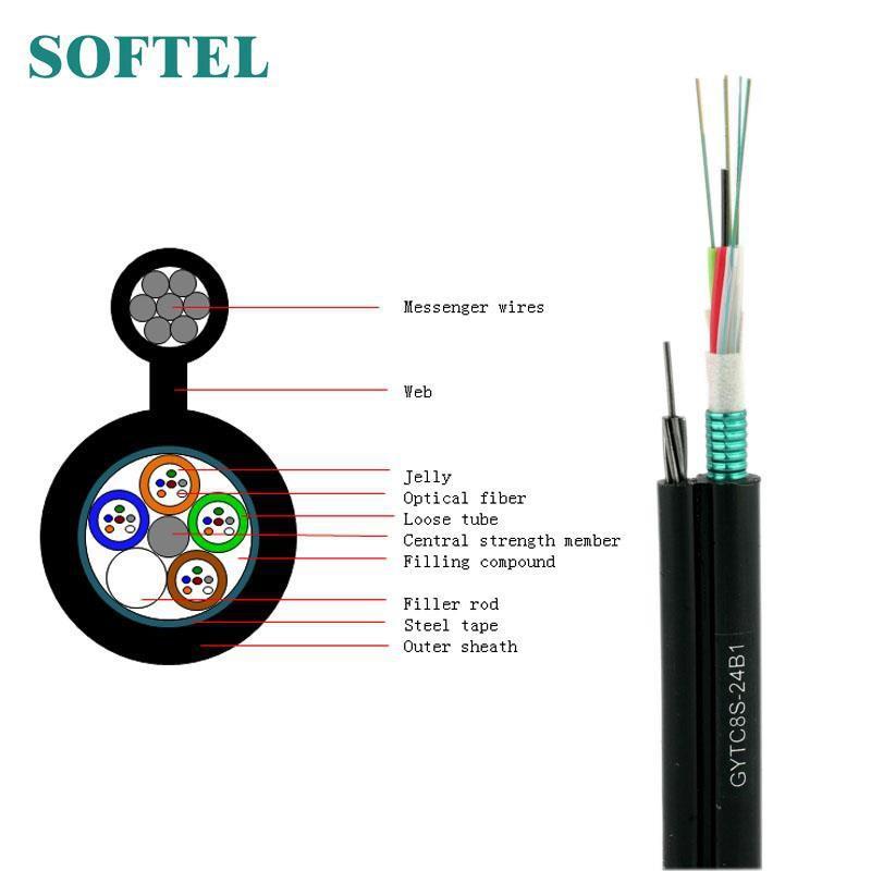 Com elemento de reforço central metálico de fio de aço e revestimento interno de barreira contra umidade incorporando fio mensageiro de aço, este cabo de fibra óptica monomodo é adequado para instalações aéreas, como poste a poste ou poste a instalações.