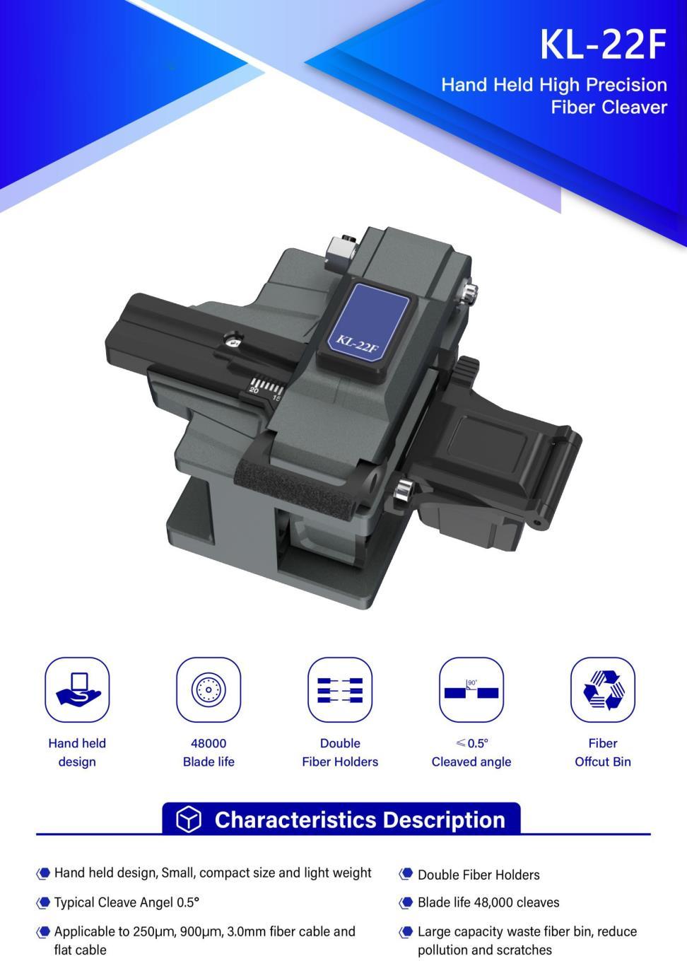 Боретесь с нестабильными результатами скалывания волокон? Высокоточный скалыватель волокон KL-22F обеспечивает непревзойденную точность и надежность для сращивания и обслуживания оптических волокон. Разработанный для инженеров и техников, этот скалыватель обеспечивает чистые, точные разрезы с минимальными усилиями, повышая эффективность установки и ремонта оптоволокна. Его прочная конструкция и удобный дизайн делают его идеальным для телекоммуникаций, центров обработки данных и промышленных приложений. Благодаря 12-месячной гарантии и возможностям настройки OEM KL-22F станет вашим надежным партнером для высокопроизводительного скалывания волокон. • Высокоточная резка | • Прочная и надежная конструкция | • Простота в эксплуатации | • 12-месячная гарантия | • Доступна настройка OEM