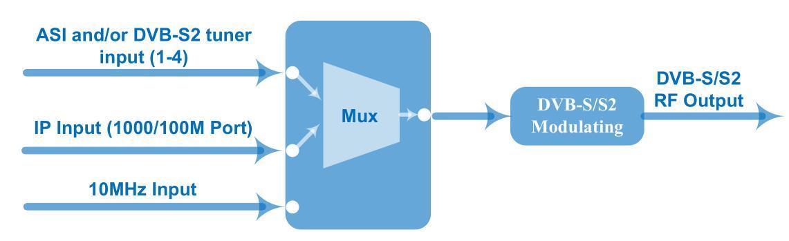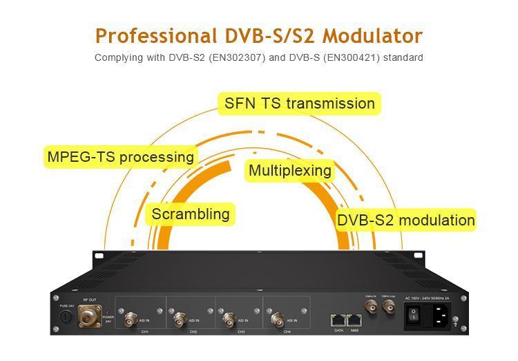 O modulador suporta saída de banda L (RF:950-2150MHz). Duas entradas estão disponíveis para alimentar o modulador, 4 interfaces ASI ou sintonizador FTA DVB-S2/S2X, capaz de comutação quase perfeita, entrada de interface 100M/1GbE para MPEG TS sobre IP.