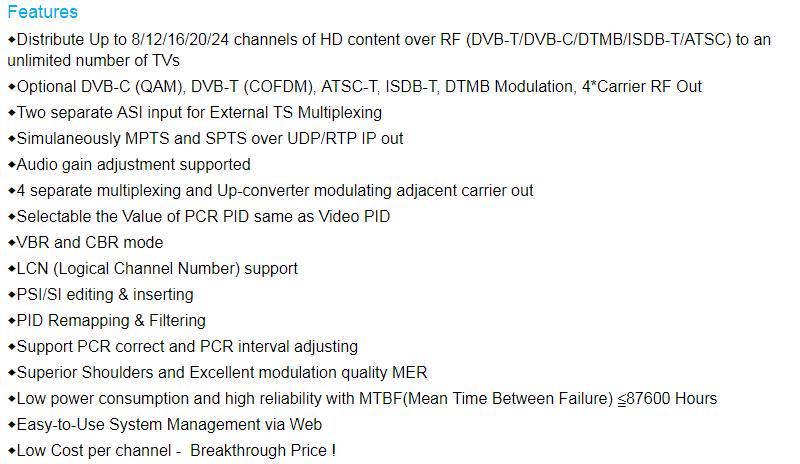هل تواجه صعوبة في توزيع إشارات الفيديو عالية الدقة عبر كابلات المحور الحالية؟ يدمج مُعدّل ترميز 8 HD TO ISDB-T ترميز H.264 المتقدم وتعديل ISDB-T لتوفير تحويل سلس للترددات الراديوية لما يصل إلى 24 مصدرًا عالي الدقة. صُمم هذا الجهاز لقنوات التلفزيون، ومحطات البث المباشر، ومُدمجات الصوت والصورة، ويدعم ترميز الفيديو بدقة 1080 بكسل بمعدل 8 ميجابت في الثانية لكل قناة، مما يضمن توزيعًا عالي الجودة في الفنادق والجامعات والمنشآت الحكومية. معتمد لمعايير ISDB-T وATSC، وهو الحل الأمثل لمشاريع هندسة الفيديو عالية الكثافة واقتصادية التكلفة. • ترميز H.264 | تعديل ISDB-T | جودة فيديو 1080 بكسل | معدل ترميز 8 ميجابت في الثانية | توزيع كابلات المحور