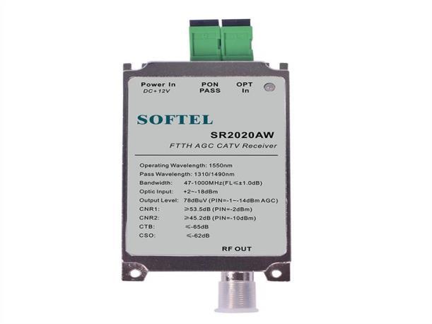 Le SR2020AW, d'une bande passante de 47 à 1 000 MHz, est un récepteur optique CATV triple play à faible consommation, hautes performances et économique, pour la télévision analogique et numérique. Il est équipé d'un tube récepteur optique haute sensibilité et d'un circuit d'adaptation à faible bruit. La réception à haute puissance optique peut être ajustée par le niveau du PAD et la sortie de limitation de lecture. Le SR2020AW présente ainsi d'excellentes caractéristiques dans une large plage dynamique de puissance optique reçue de +2 dBm à -21 dBm.