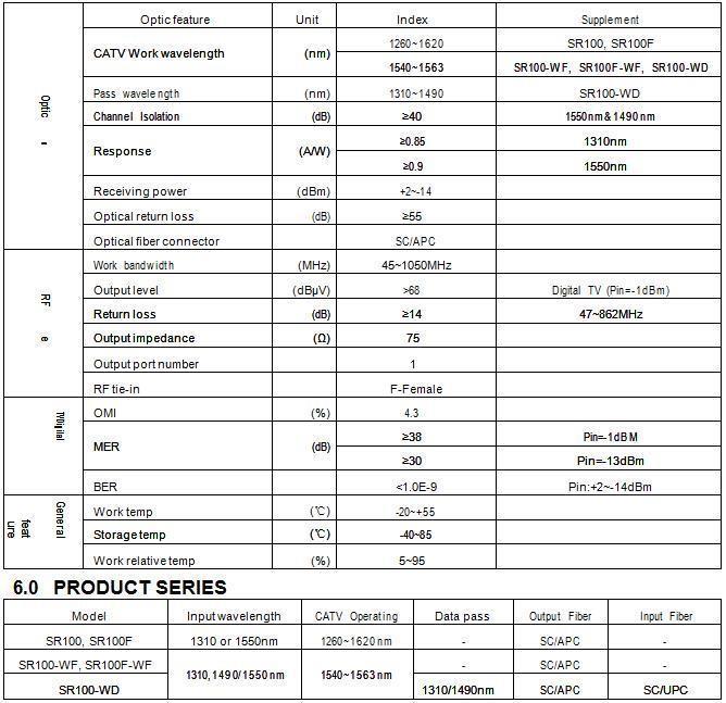 SR100-SC verwendet eine hochempfindliche optische Empfangsröhre und benötigt keine Stromversorgung. Bei einem optischen Eingangsleistungspegel Pin = -1 dBm und Vo = 68 dBuV ermöglicht er eine kostengünstige und flexible Anwendungsintegration und ermöglicht die Nutzung von Glasfaser imHeimnetzwerk.