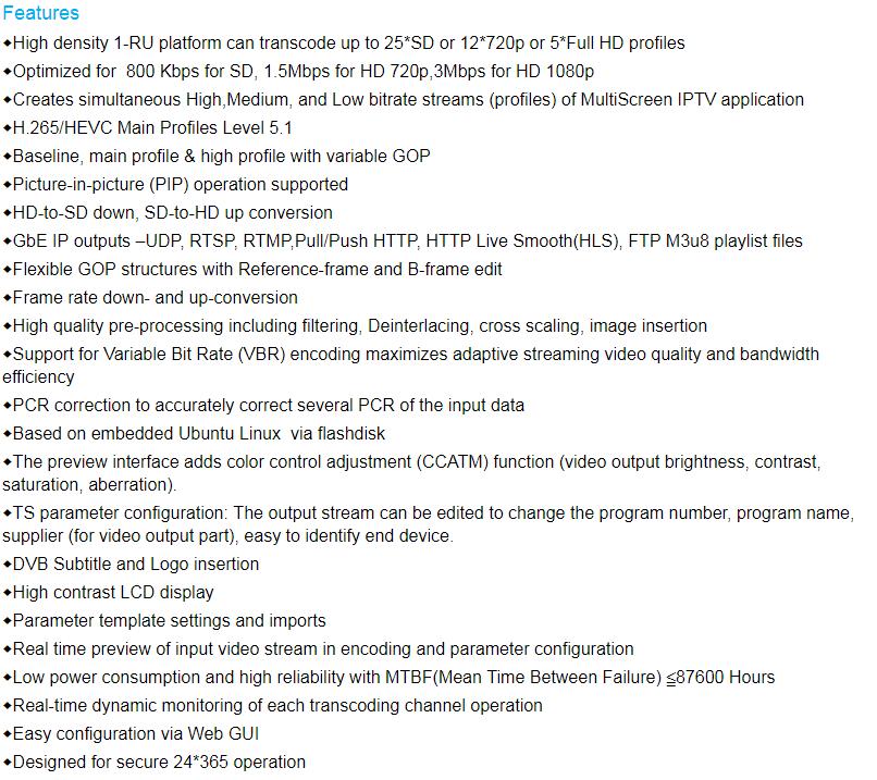 Боретесь с неэффективностью полосы пропускания и плохим качеством видео в многоканальных развертываниях? Цифровая головная станция кабельного телевидения 25SD/41080P/14K обеспечивает непревзойденную эффективность полосы пропускания и превосходное качество видео, что делает ее идеальной для вещательных, гостиничных и корпоративных приложений. Благодаря поддержке кодирования MPEG-2, H.264 и MPEG4 эта головная станция обеспечивает бесперебойную потоковую передачу H.264 в реальном времени с разрешением до 4K. Ее высокоплотная возможность транскодирования обрабатывает 200 каналов одновременно, предлагая экономичное и надежное решение для крупномасштабных развертываний. Сертифицированная для совместимости с IPv4, IGMP V2 и V3 и MPTS/SPTS, она пользуется доверием ведущих системных интеграторов по всему миру. • Высокоплотная транскодирование для 200 каналов | • Поддерживает MPEG-2, H.264, MPEG4 | • Прямая трансляция H.264 до 4K | • Совместимость с IPv4, IGMP V2 и V3 | • Экономически эффективный и надежный
