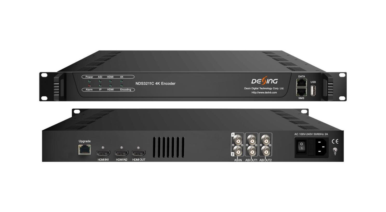 NDS3211C è un nuovissimo encoder 4K professionale progettato da Dexin. È dotato di due ingressi segnale UHD HDMI (2.0) (ridondanza a caldo) che supportano il formato di codifica video H.265/HEVC e H.264/AVC e la codifica audio MPEG1 Layer 2, LC –AAC e la codifica audio passthrough DD AC3. Può emettere 1 TS codificato tramite 4 porte di uscita ASI e 4 uscite MPTS tramite porta di uscita GE.