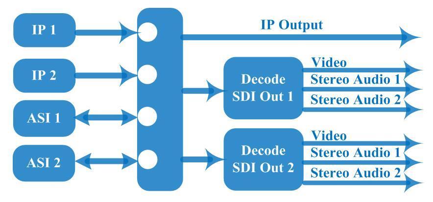 Es handelt sich um ein 1-HE-Gehäuse, das sowohl IP- als auch ASI-Eingänge unterstützt. Nach dem Dekodierungsprozess gibt es 2 Kanäle HD/SD-SDI-Videos mit in jedem Port eingebettetem Dual-Stereo-Audio aus. Es unterstützt auch 1 IP-Ausgang (MPTS) und verfügt über duale bidirektionale ASI-Ports für abwechselnden Eingang und Ausgang.