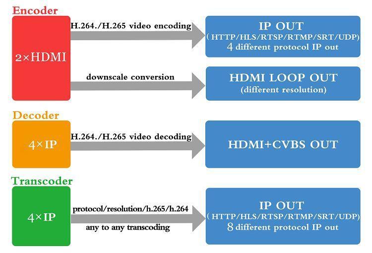 • Codifica da HDMI a IP H.264/H.265 | Decodifica da IP a HDMI/CVBS | Transcodifica da IP a IP | Funzione PIP | Gestione remota Web/APP