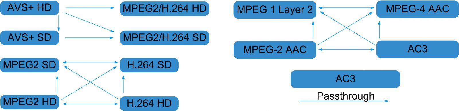 * Transcodifica video: AVS+ SD/HD in MPEG-2 SD/HD e H.264 SD/HD; MPEG-2 SD/HD e H.264 SD/HD da qualsiasi a qualsiasi