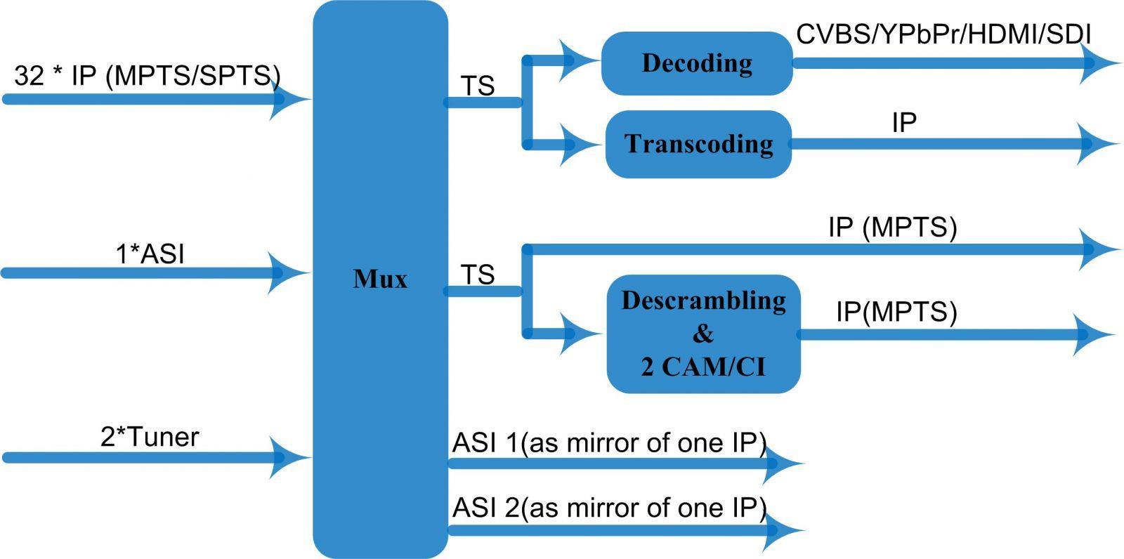 * Supporta 32*ingresso IP (UDP/RTP) + 2*ingresso sintonizzatori con 2 slot CAM/CI + 1 ingresso ASI
