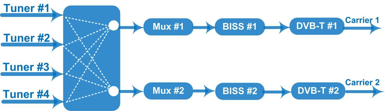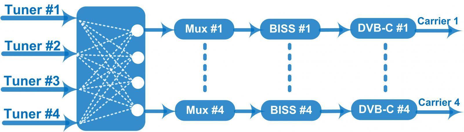 * Demodulieren + erneutes Multiplexieren + BISS-Entschlüsselung + Modulation in einer Box