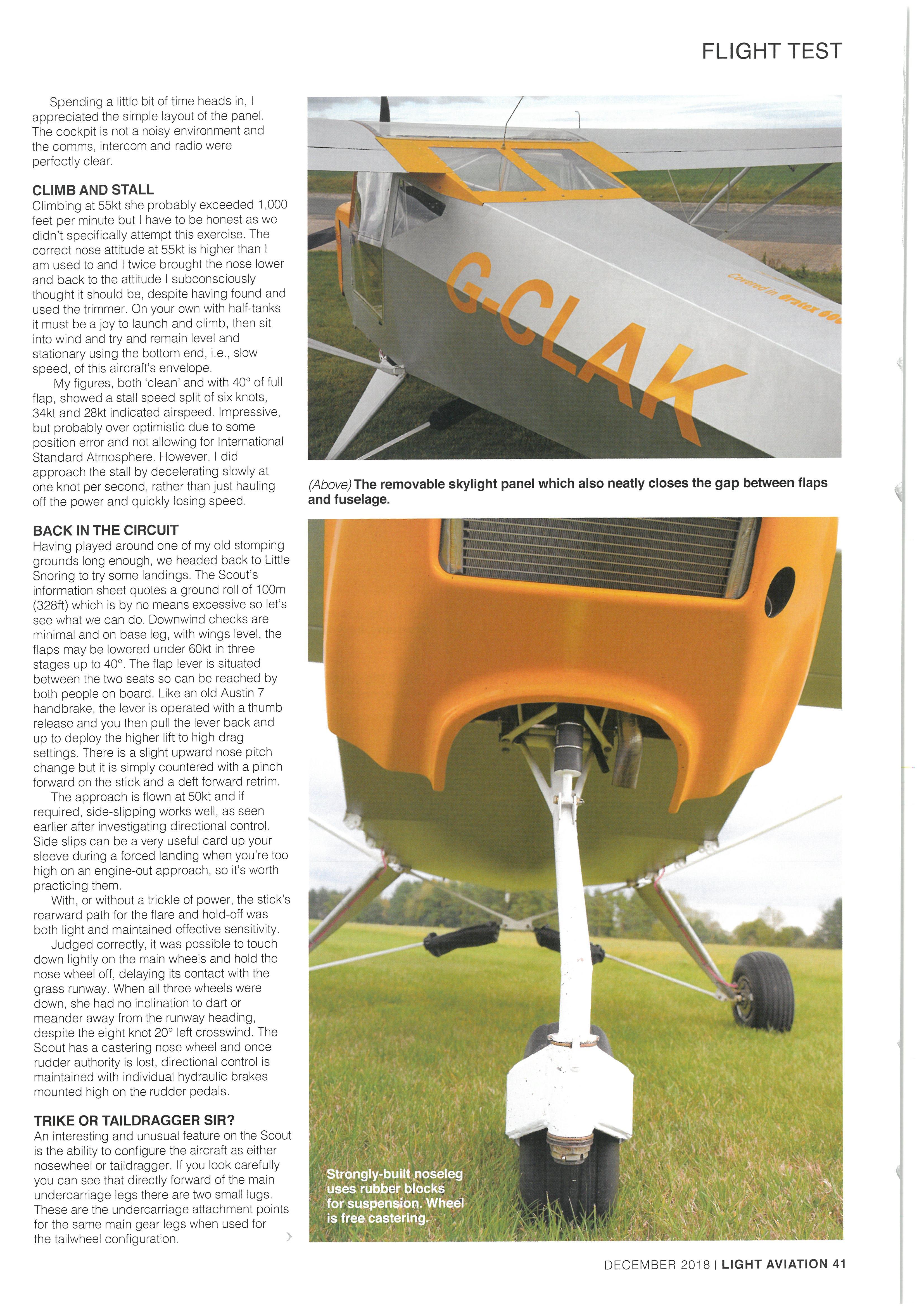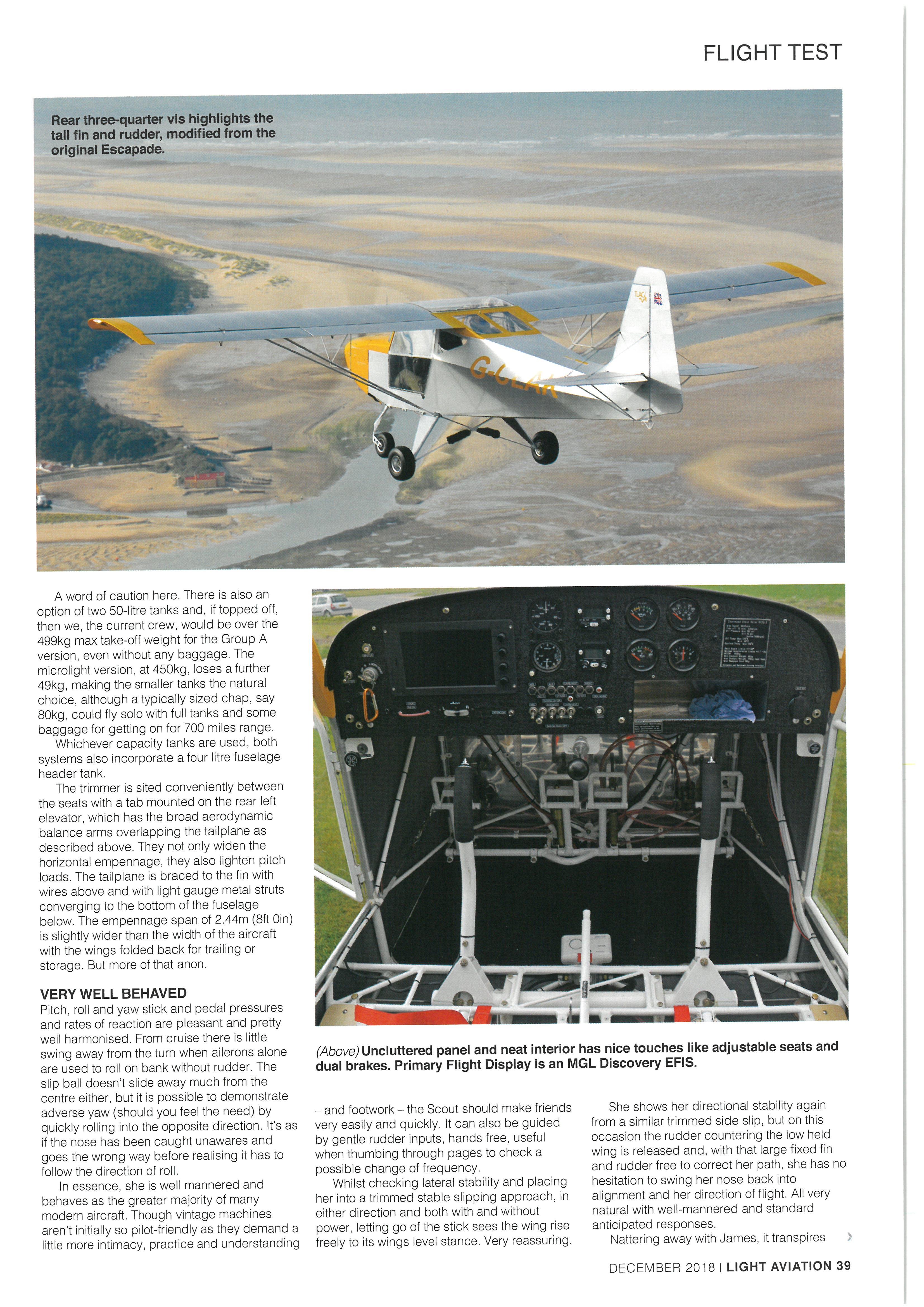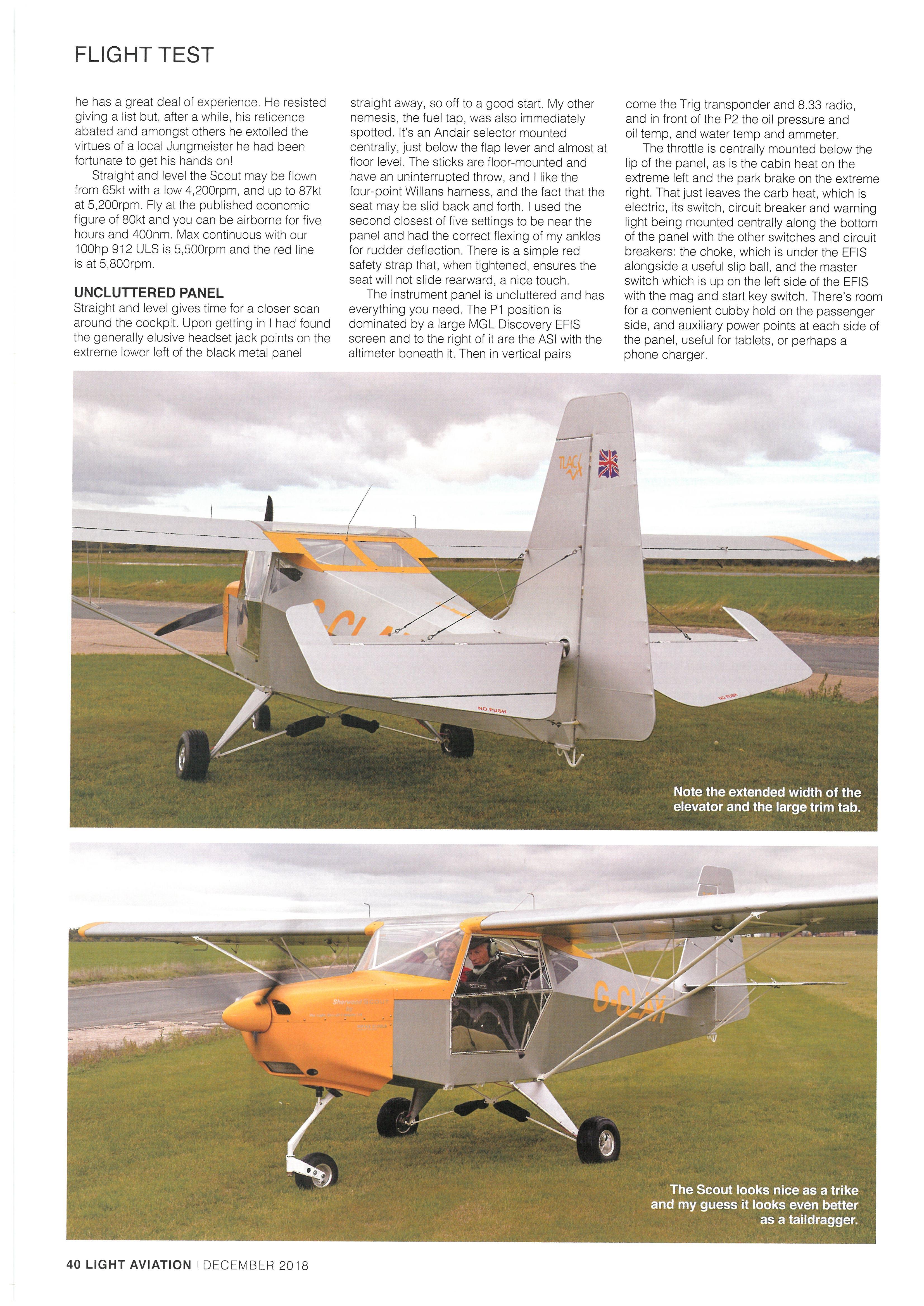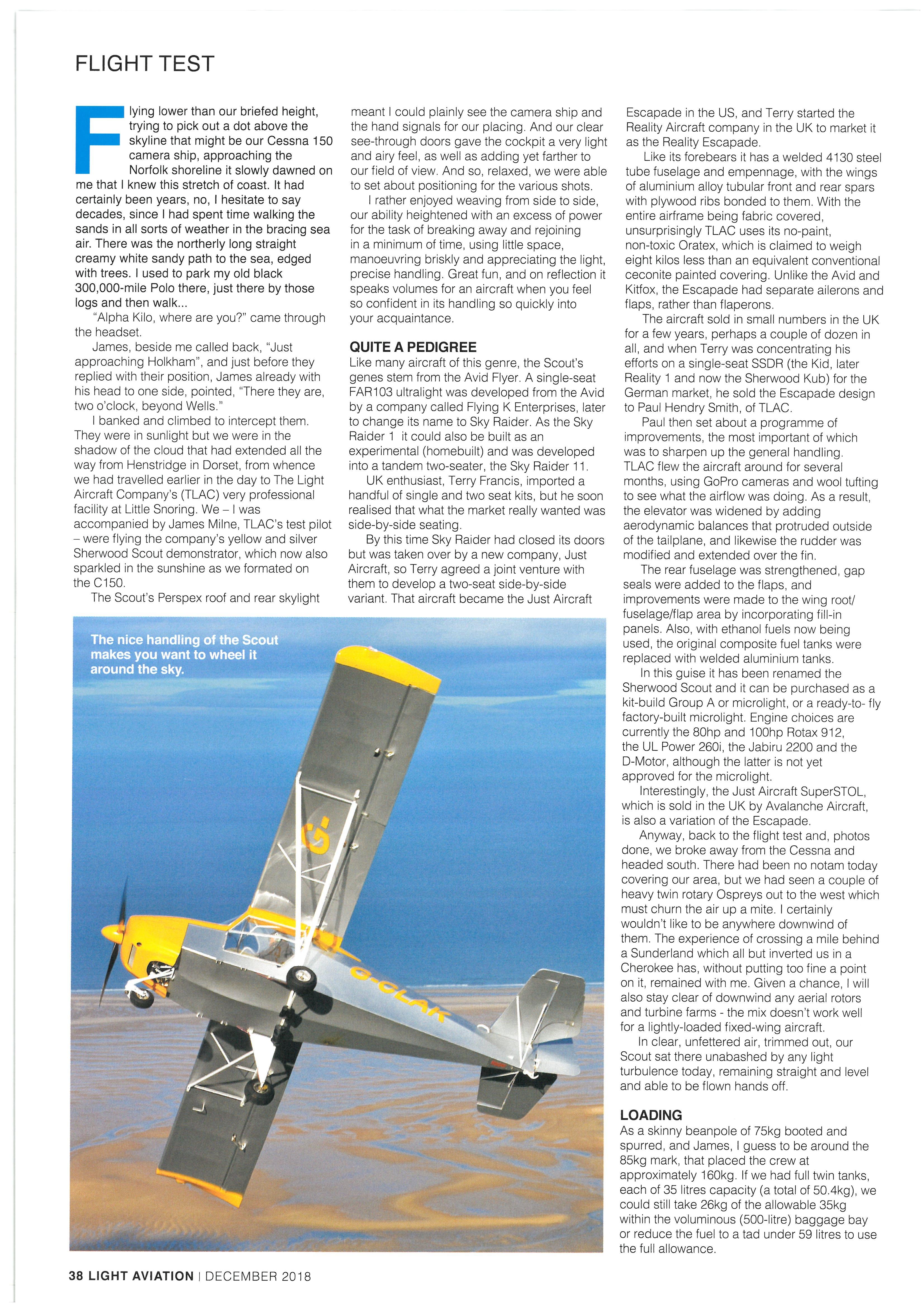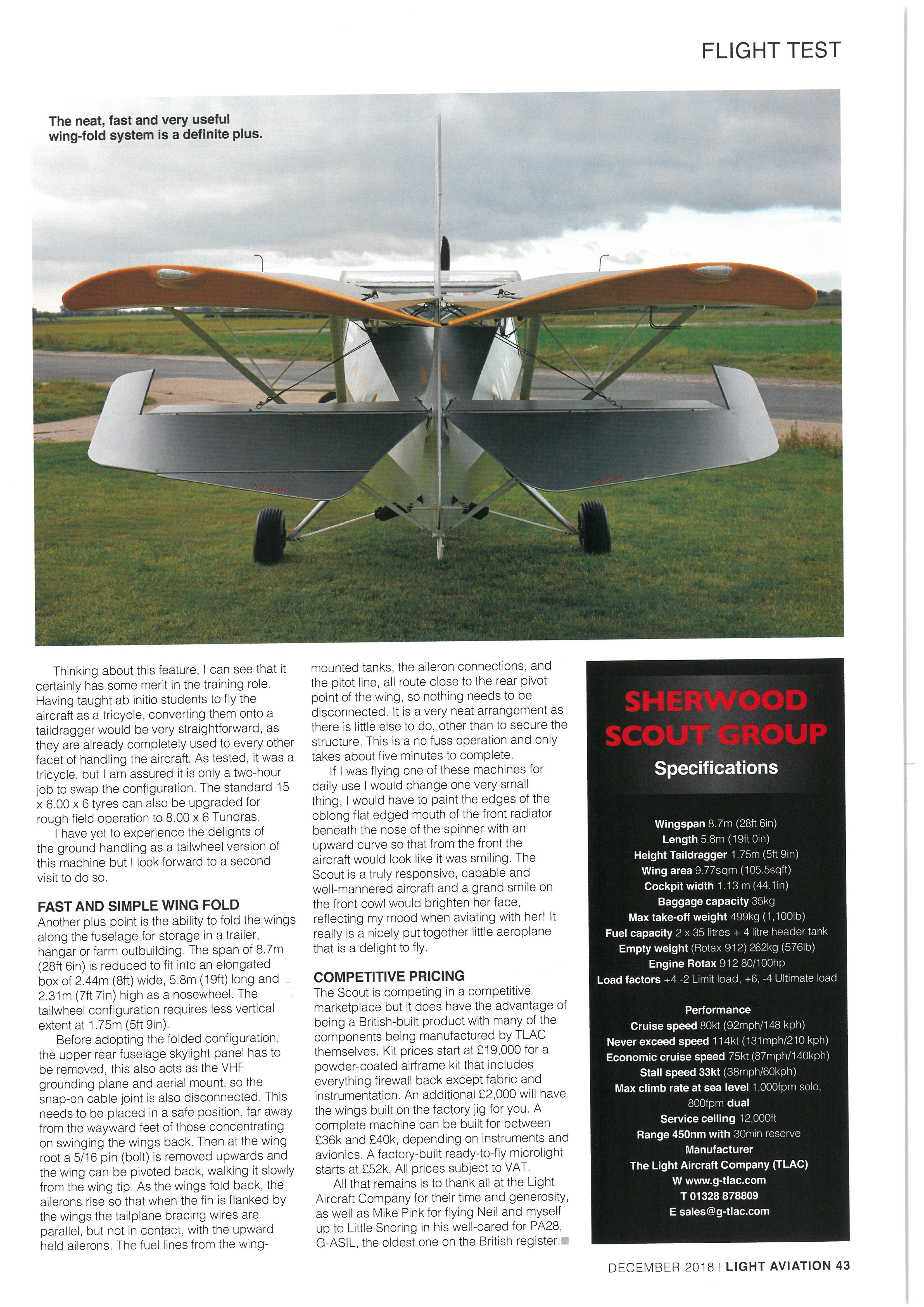 This month's flight test is a Britishdesign, well worth celebrating as sadly there aren'ttoo many British light aircraft manufacturers about. The TLAC Scout is an improved version of the Reality Escapade and deserves to do well. It competes with a number of similar machines, all of them with a foot in the Avid Flyer/Kitfoxcamp, but the market seems to hold up well and Clive Davidson certainly enjoyed flying the Scout on a