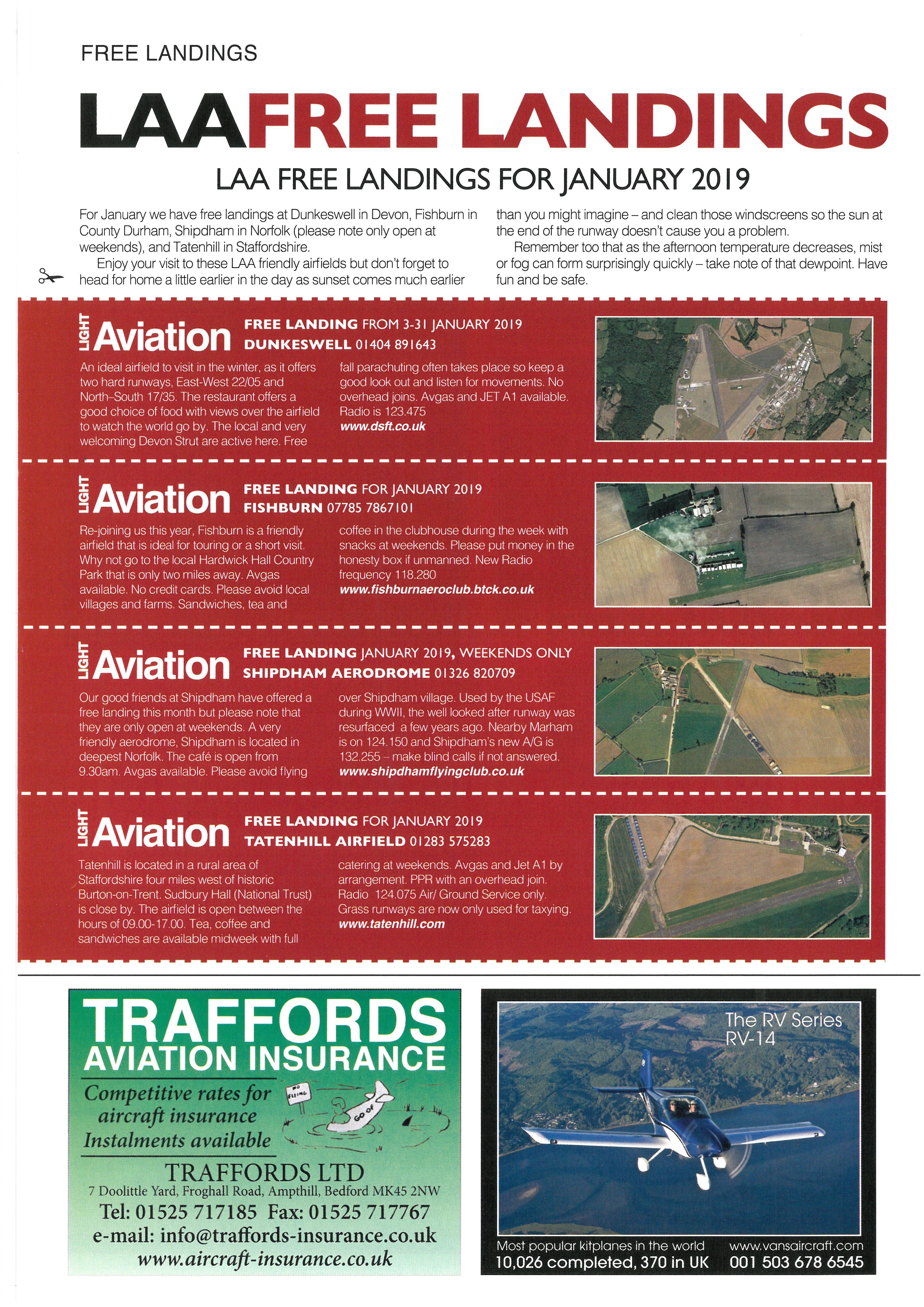 ForJanuarywehavefreelandingsatDunkeswellinDevon,Fishburnin thanyoumightimagineandcleanthosewindscreenssothesunat CountyDurham,ShipdhaminNorfolk(pleasenoteonlyopen at theend ofthe runwaydoesn’tcauseyou a problem. weekends), and Tatenhillin Staffordshire. Remember too that as the afternoontemperature decreases, mist Enjoyyourvisitto theseLAAfriendlyairfieldsbutdon’tforgetto orfog canformsurprisinglyquickly take noteofthatdewpoint.Have