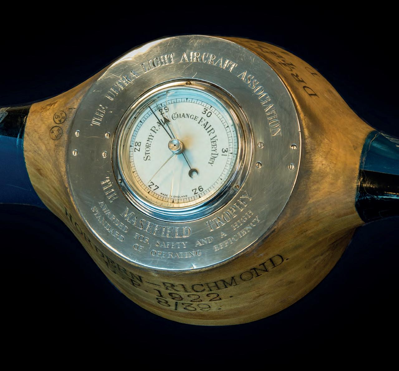 HQ Members’ Lounge is one of the Ultra-Light Aircraft Association’s earliest trophies. Housing a barometer, The Masefield Trophy is a Hordern Richmond propeller designed for the 44hp Train 4T inline four-cylinder engine, fitted to Chilton DW.1A Monoplane G-AFSV. It was the only example to use the French engine and was flown by its designer, the Hon A W H Dalrymple, in the Folkestone Aero Trophy Race at Lympne on 5 August 1939, winning at an average speed of 126mph.