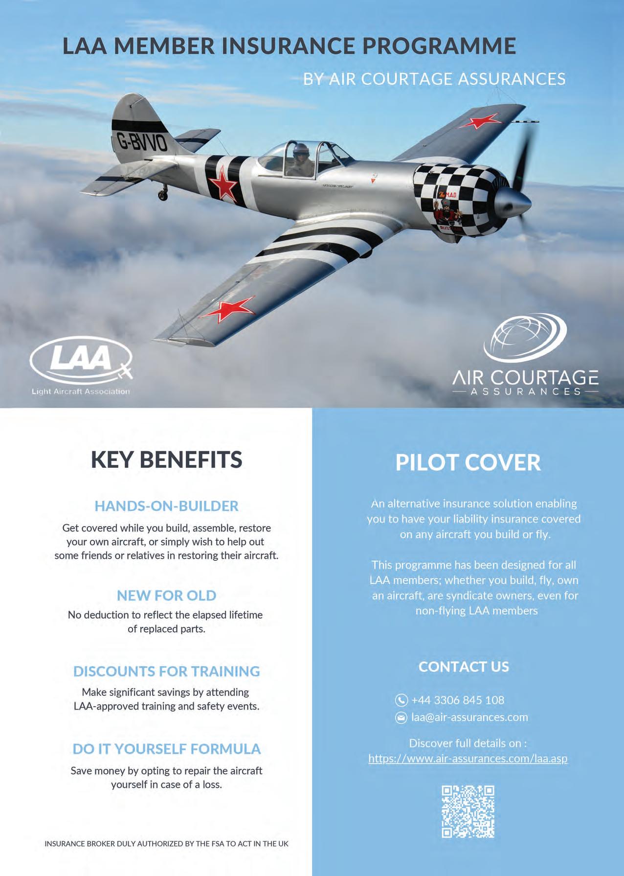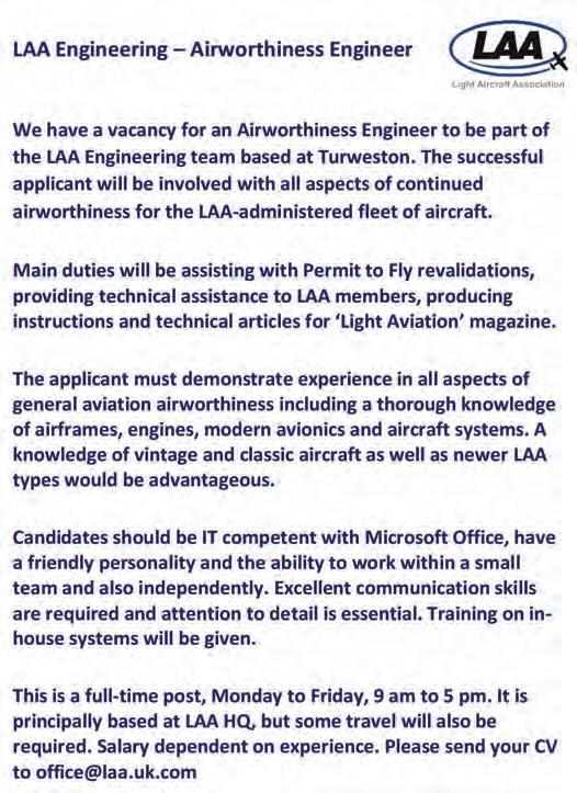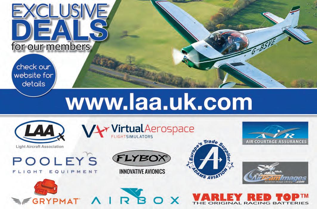 AIRCRAFT APPROVED? Members and readers should note that the inclusion of all advertisements in the commercial or classified sections of this magazine does not necessarily mean that the product or service is approved by the LAA. In particular, aircraft types, or examples of types advertised, may not, for a variety of reasons, be of a type or standard that is eligible for the issue of a LAA Permit to Fly. You should not assume that an aircraft type not currently on the LAA accepted type list will eventually be accepted.