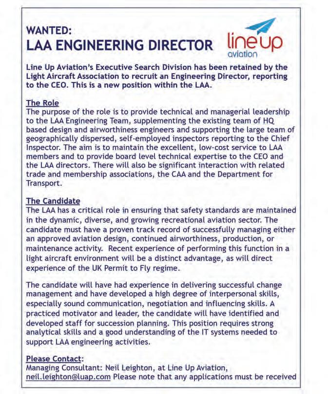AIRCRAFT APPROVED? Members and readers should note that the inclusion of all advertisements in the commercial or classified sections of this magazine does not necessarily mean that the product or service is approved by the LAA. In particular, aircraft types, or examples of types advertised, may not, for a variety of reasons, be of a type or standard that is eligible for the issue of a LAA Permit to Fly. You should not assume that an aircraft type not currently on the LAA accepted type list will eventually be accepted.