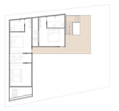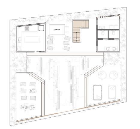 Upon stepping into the guesthouse, guests are embraced by an indoor-outdoor lifestyle, seamlessly blending the boundaries between inside and out. The courtyard - also the social heart of the building, where the majority of daytime activities unfold, fostering a feeling of openness with greenery and natural light filtering through the surrounding trees, (domesticated trees) offering a lively mix of commercial-social and cultural functions. Throughout the building, nature intertwines with architecture, becoming an integral part of the guesthouse experience.