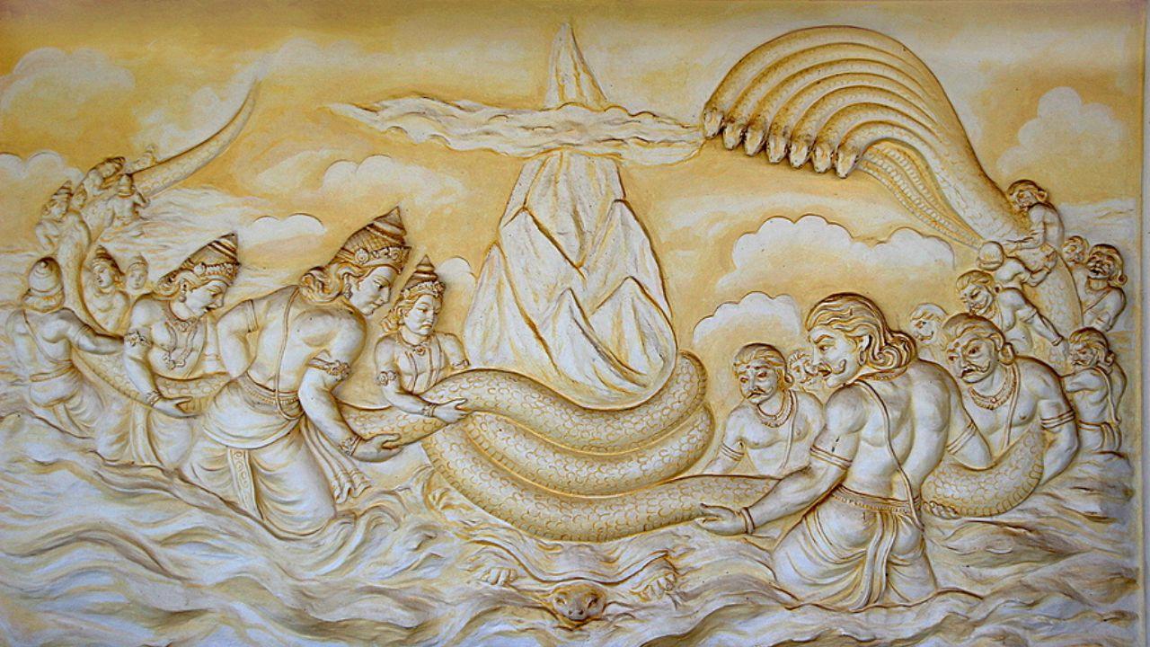 Samudra Manthan involves Devas (gods) and Asuras (demons) collaborate to churn the ocean to obtain amrita (nectar of immortality) and other treasures