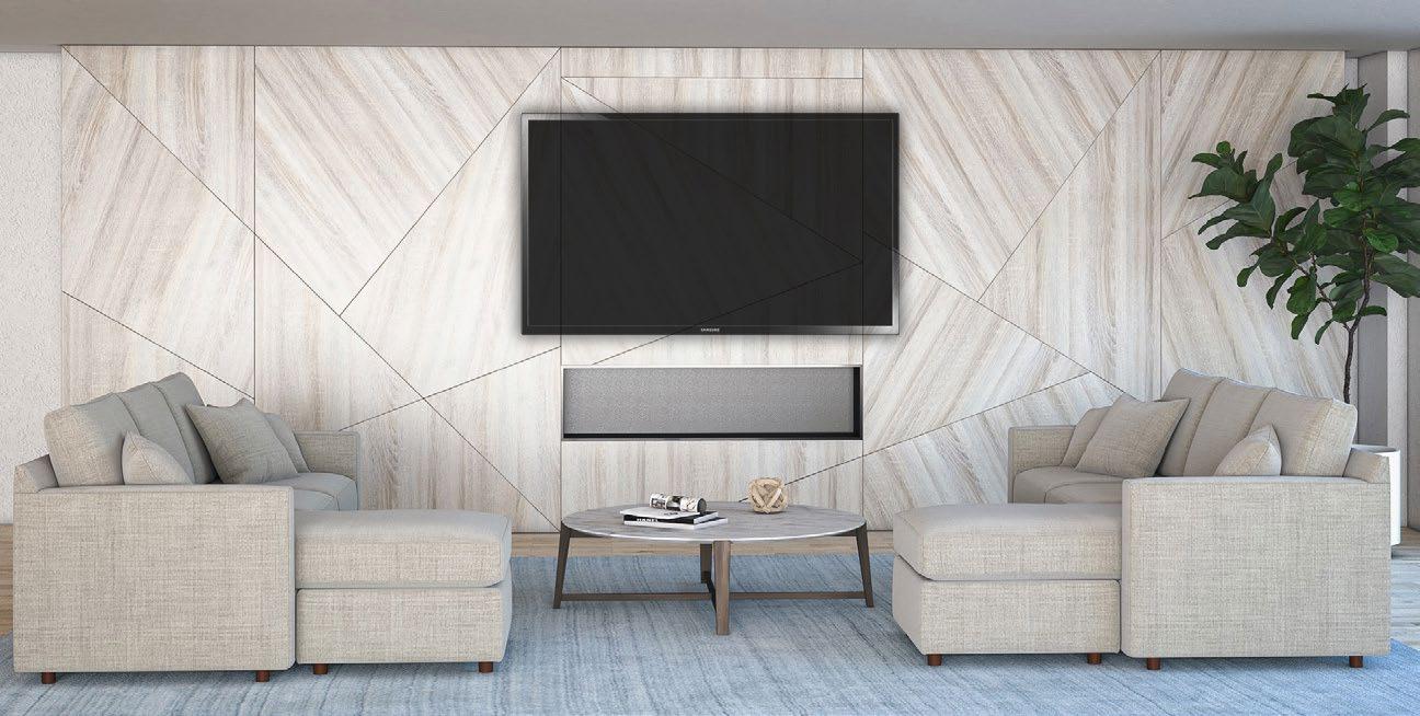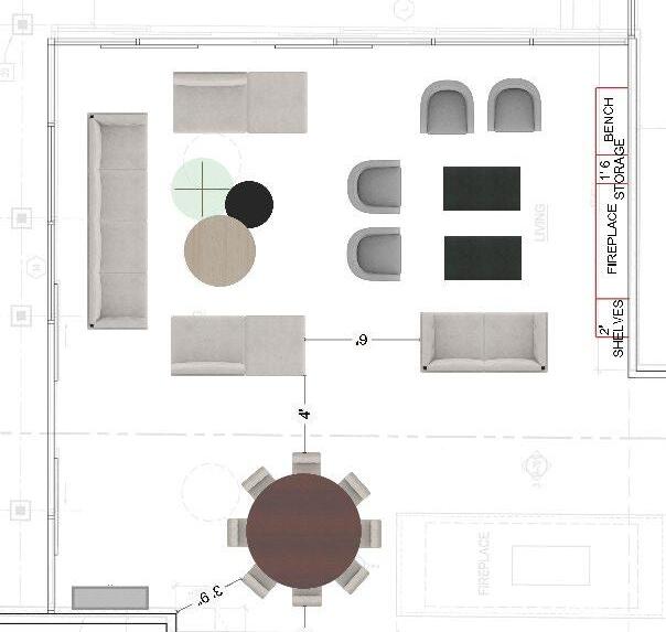 We wanted to incorporate this geometric wood inlay design for the surround, and framed the fireplace in slab for it to be to code. GREAT ROOM RENDERING