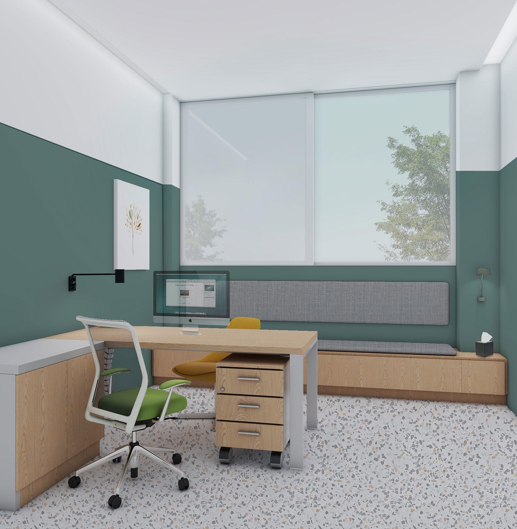A therapist’s office is a space where therapists meet with patients to provide mental health and emotional support. The space is designed to be light and clean, with soothing sage color and natural wood finishes that promote a sense of calmness and relaxation. It is strategically located near windows to allow natural light into the room, which is known to boost patients’ moods. Additionally, nature-based artwork is added throughout the space to create a connection with nature and enhance the healing environment.