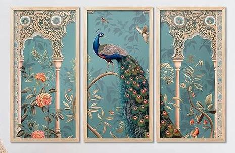 This mood board combines classical design elements with luxurious materials for a refined, timeless aesthetic. Cane furniture, known for its natural texture, adds warmth and elegance, ideal for creating sophisticated seating and storage pieces. Brass accents in lighting fixtures and furniture details bring a touch of opulence, complementing other materials with its rich, golden tones. Bone inlay is used in furniture and decor, showcasing intricate craftsmanship and adding visual interest with its delicate patterns. Persian rugs, with their vibrant colors and detailed designs, anchor the space, offering warmth and cultural richness. The addition of Pichwai art introduces spiritual and historical depth, with its vivid depictions of Indian mythology enhancing the overall atmosphere. Together, these elements form a harmonious blend of textures, colors, and cultural influences, creating a luxurious yet welcoming interior that evokes timeless beauty, sophistication, and artistry.