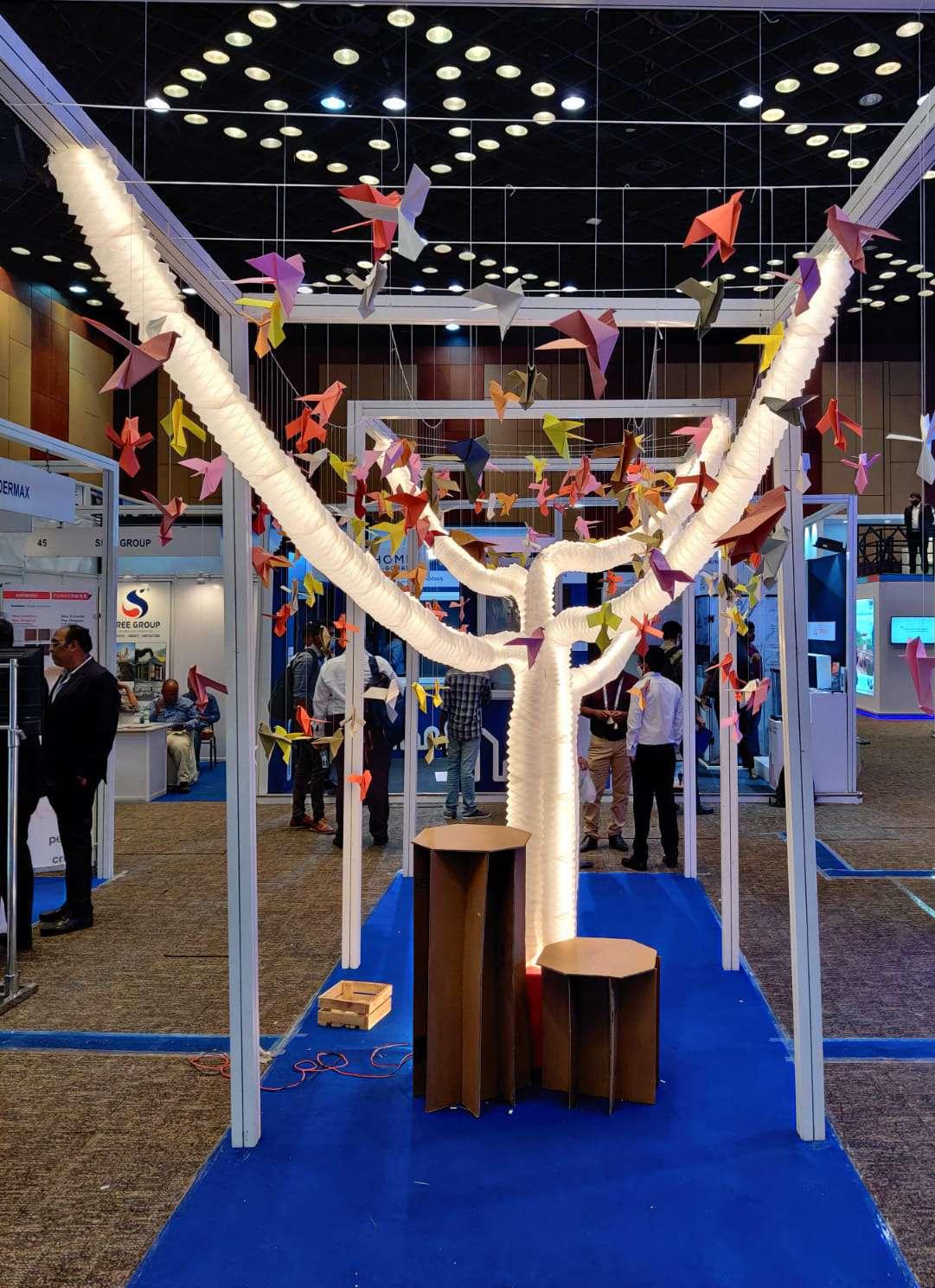 On invitation from the IIA NatCon team for setting up an art installation at the event venue, we came with the idea of an origami tree and branching canopy with floating birds. Materials used were Gateway sheet, cardboard and color paper.