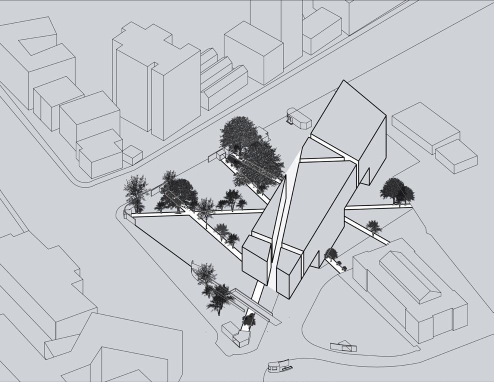 Central to the design was the inquiry, “How does an institutional structure interact with its surroundings in the urban fabric?” This question led to an exploration of the Deleuzian concepts of ‘becoming’; ‘the fold’ and ‘rhizome’.