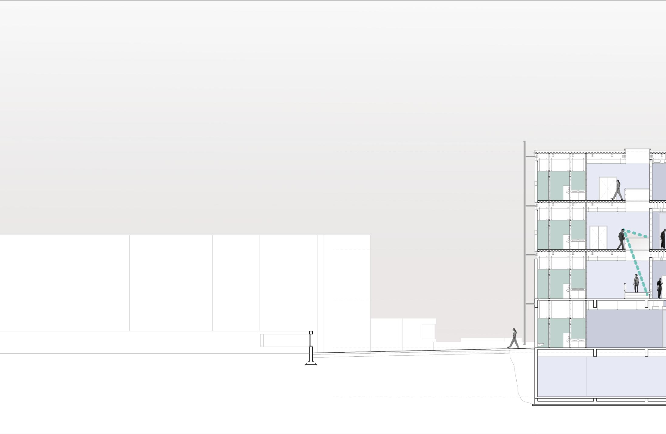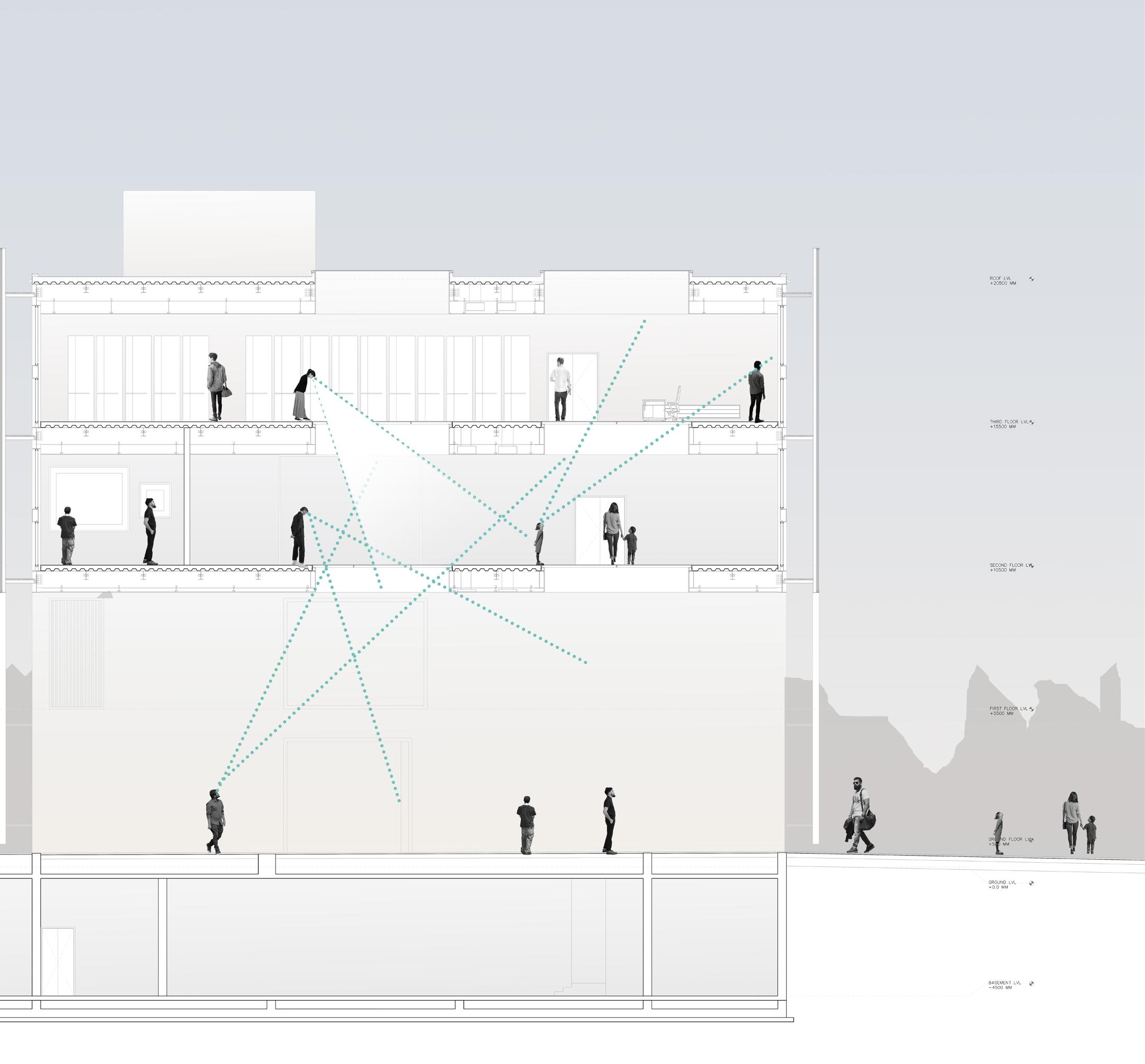 The project seeks to propose a design that bears traces of becomings of the city and the structure. This is achieved by employing urban artifacts and projecting indexical lines and traces onto the proposed structure, puncturing its form to facilitate a dynamic interaction between the institutional structure and its urban context, embodying a rhizomatic structure of continual multiple becomings.