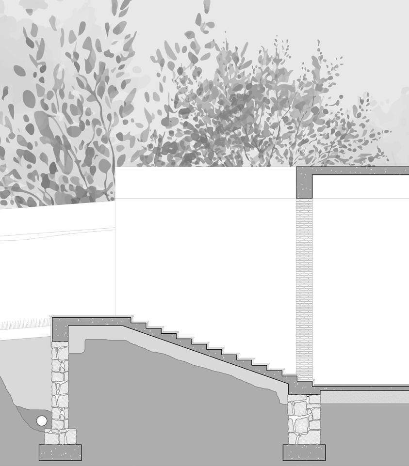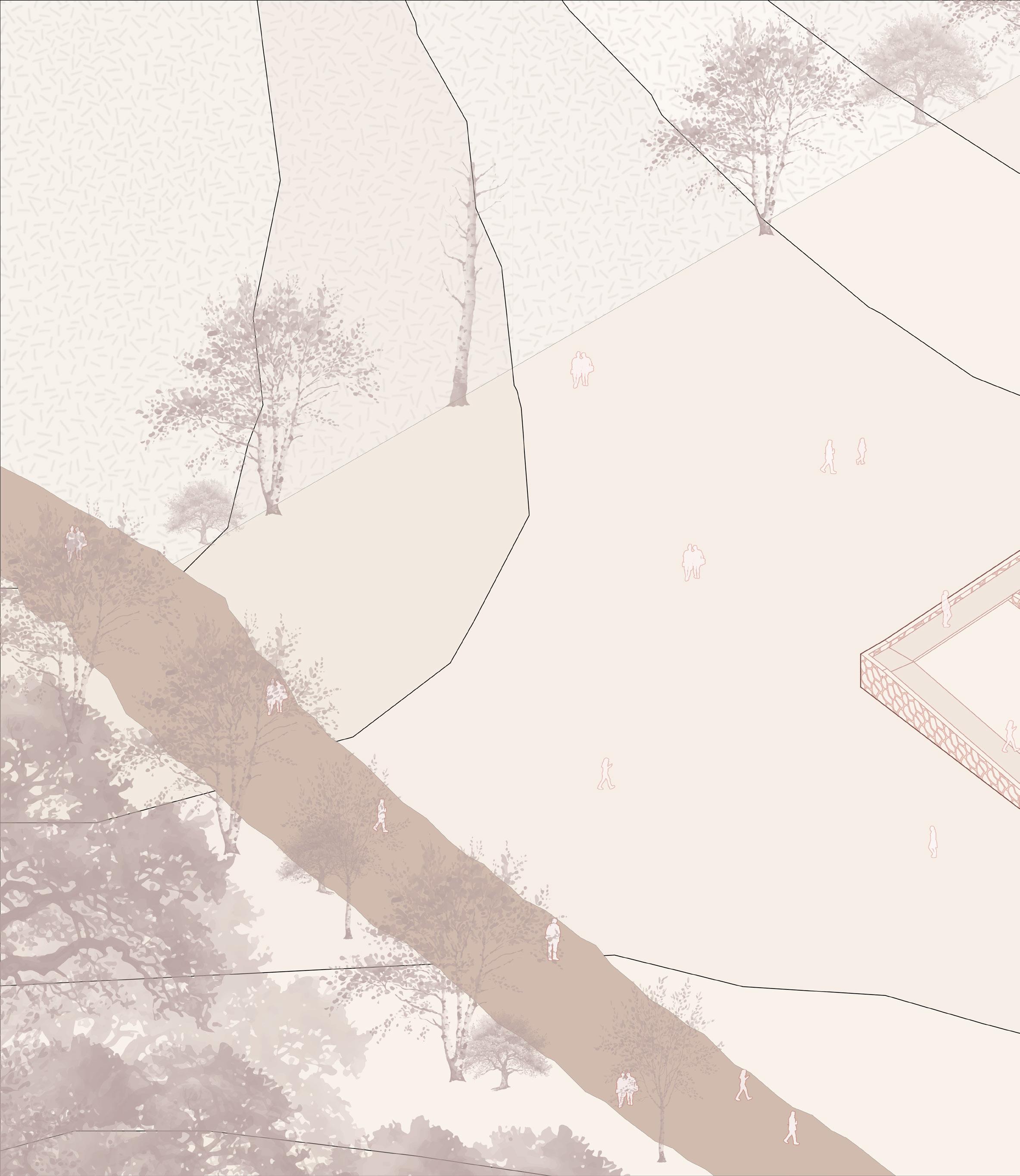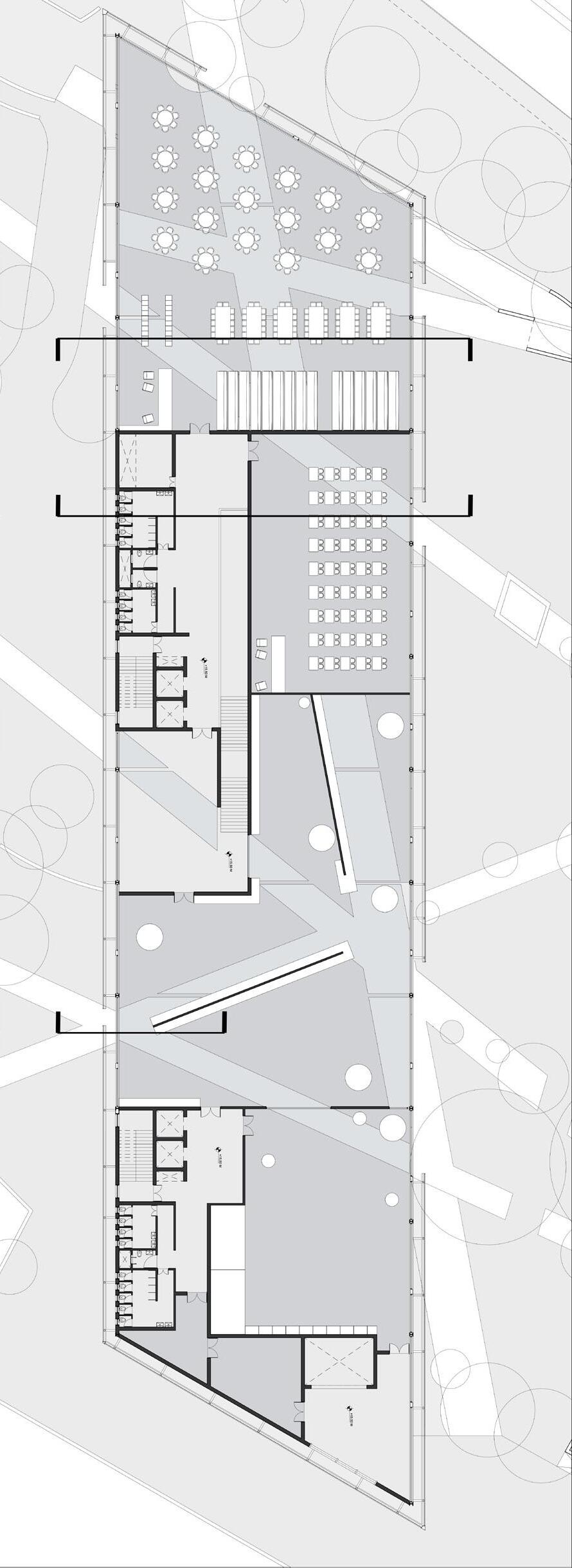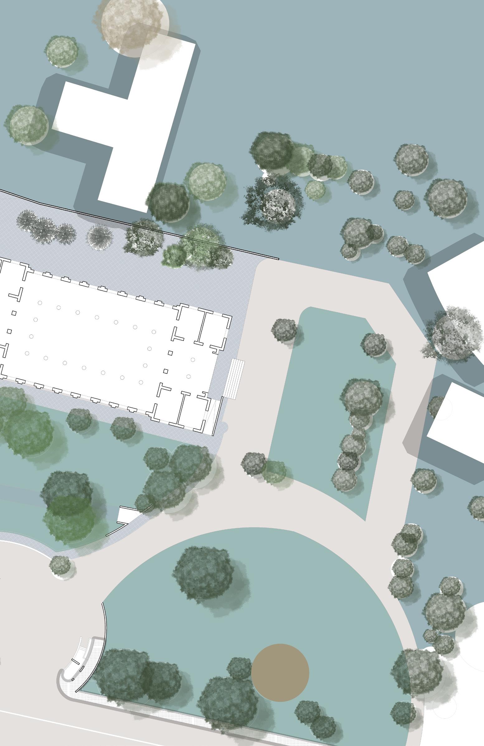 6 In the plaza located north of the Museum, these indexical lines define the landscaped areas incorporating plants and trees. These unpaved sections of the site, marked by these indexical lines, are left open to the dynamic interventions of local inhabitants over time. This seeks to harmonize the fluid, socially determined space with the traditional formality of the city plaza, fostering an environment that respects both historical continuity and contemporary social practices.