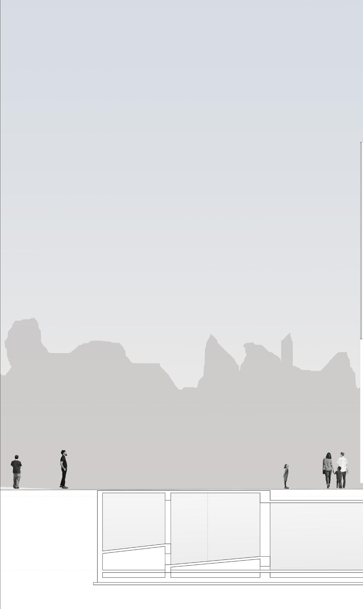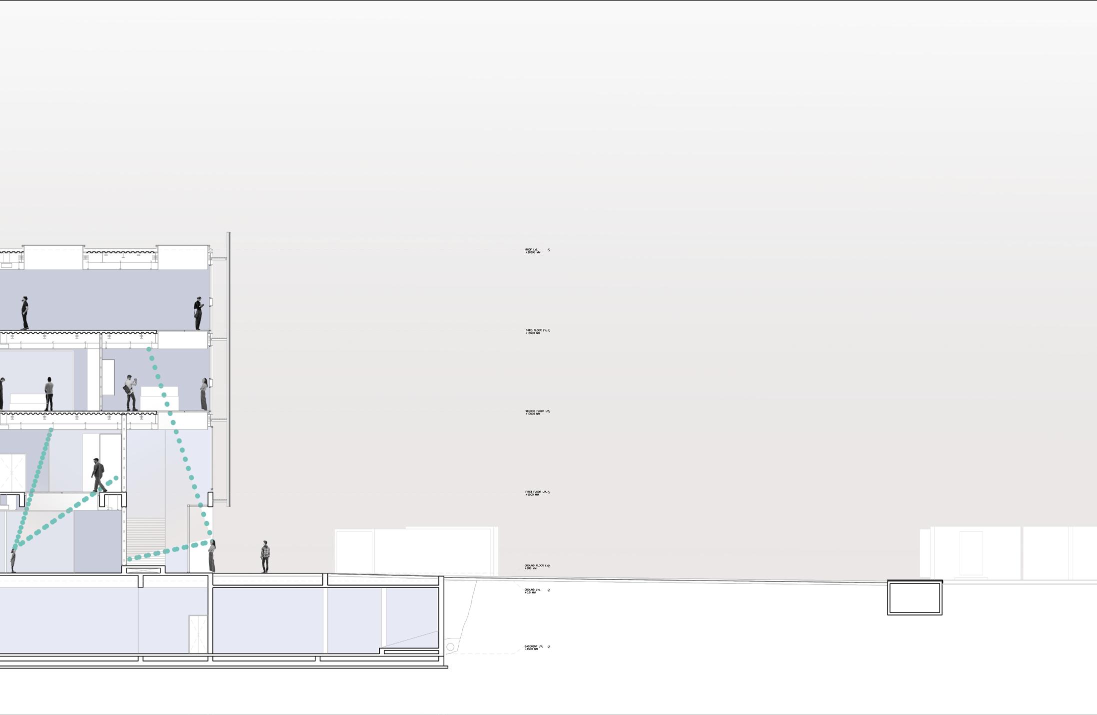 13 Second Floorplan Section BB’ Second Floorplan: 1 Architecture and Design Gallery 2 Textile Gallery 3 Temporary Gallery 4 Film and Photography Gallery 5 Painting Gallery 6 Prints Gallery 7 Staff Storage 8 Staff Foyer 9 Janitor’s Room 10 Elevators and Staircase 11 WCs Section BB’: 1 Children’s Museum 2 Stairs to First Floor 3 Gallery Foyer 4 Mumbai Gallery 5 Textile Gallery 6 WC 7 Workshop 8 Visitor Basement Parking 9 Ramp to and from Ground Level N 2 4 5 5 7 8 8 9 0M 5M 10M 20M