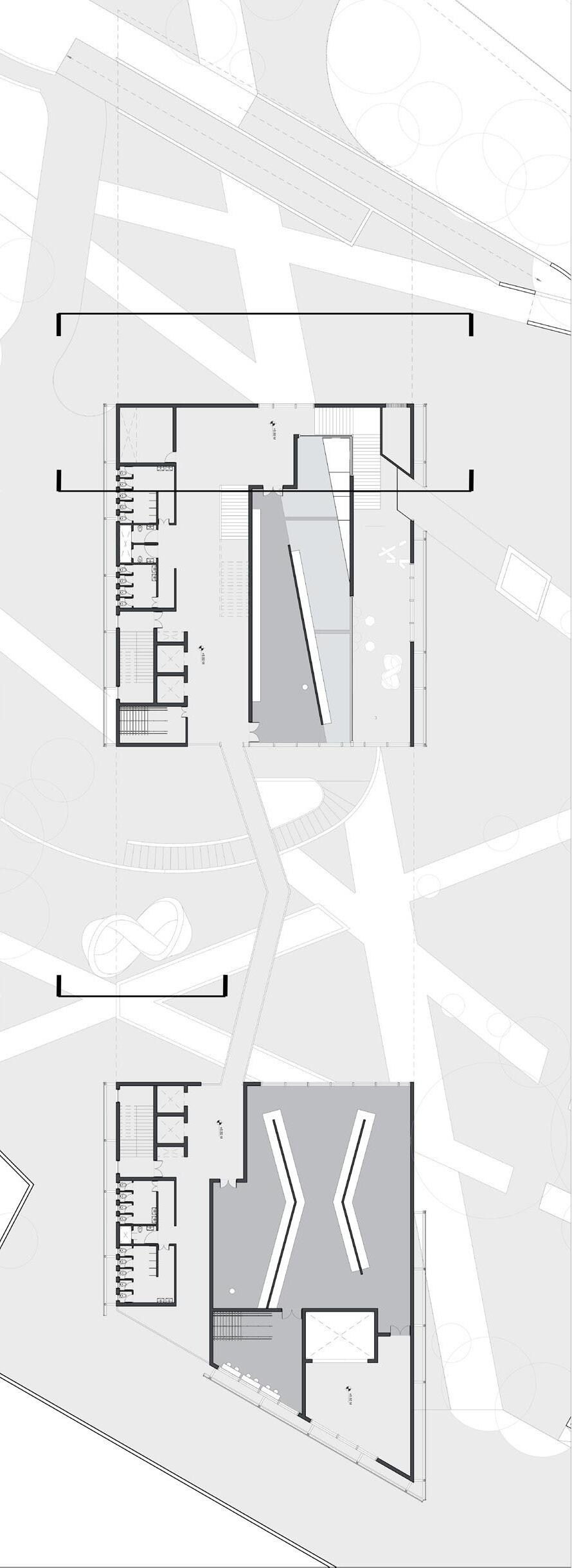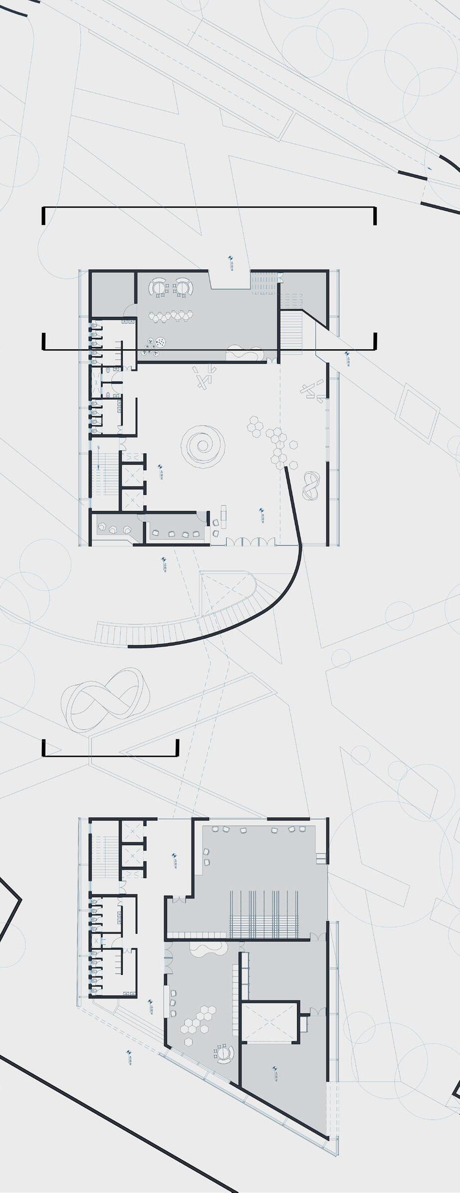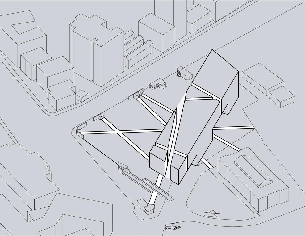 5 Indexical lines emanating from these urban artifacts are projected onto the site, influencing both the facade and floors of the structure. These lines manifest as openings in the facade and glass flooring, serving as the locus of these spatial relationships.