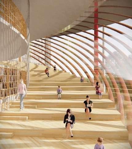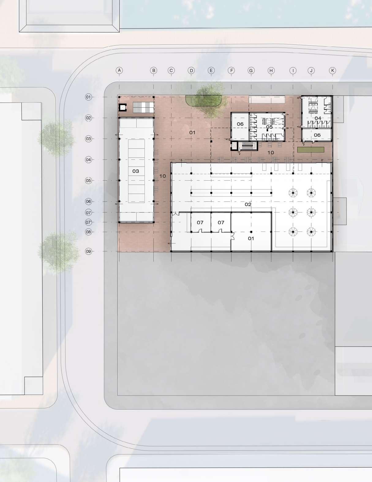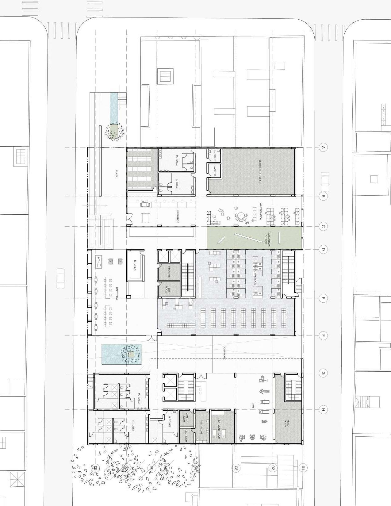 Perched at the very heart of the city, overlooking the city's lungs, and embraced by a culturally significant plaza, the design seamlessly blends into the urban landscape. It boasts a warm and inviting façade that establishes a harmonious connection between the structure and the lush garden buffered by Minsq Square at the forefront. Elevated gracefully, it presents a shaded open amphitheater, inviting the city to partake in its serene ambiance.