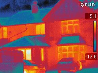 This delivers an estimated 50% reduction in heat loss and combined with cavity wall insulation delivers up to 80%. The physical evidence is shown in the thermal images below which clearly show before double glazing - bright red heat loss in the window areas to after - virtually no heat loss