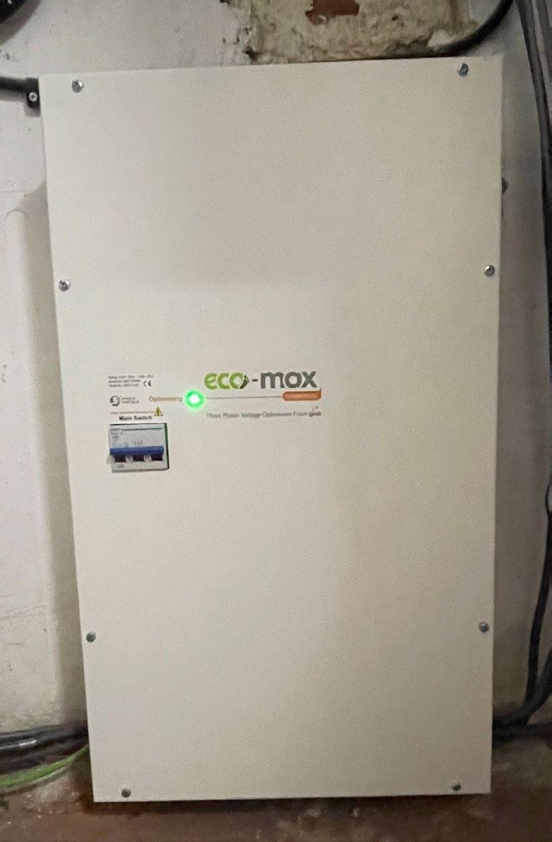With a view to saving money and reducing our carbon emissions we installed an ECO MAX voltage optimiser for the mains input reducing the electricity we use to 220 volts saving circa 8.5% on our electricity bill. The environmental bonus – an annual reduction of 2,296 KgCo2