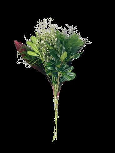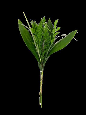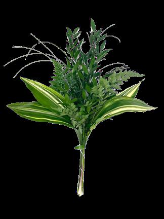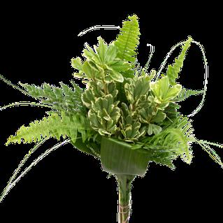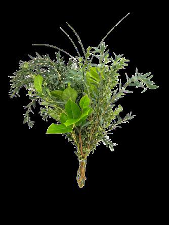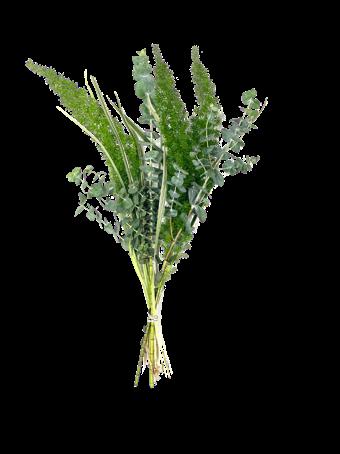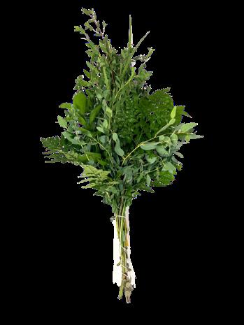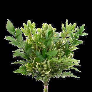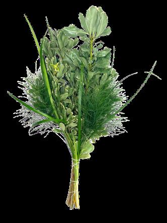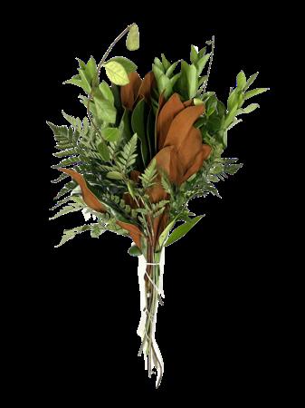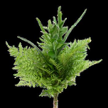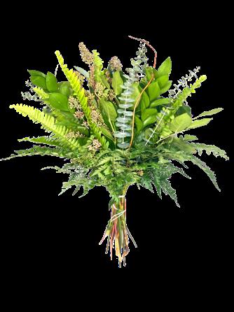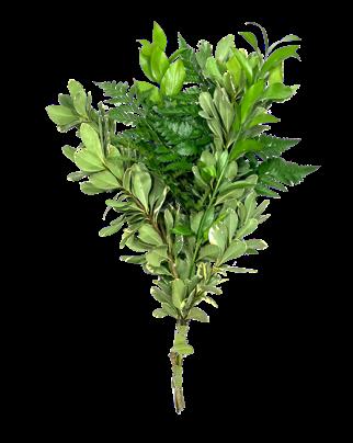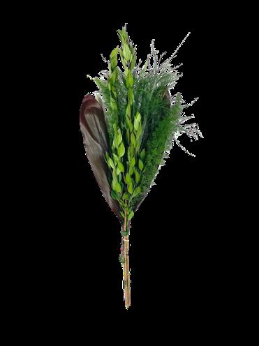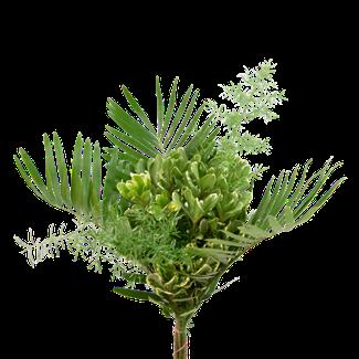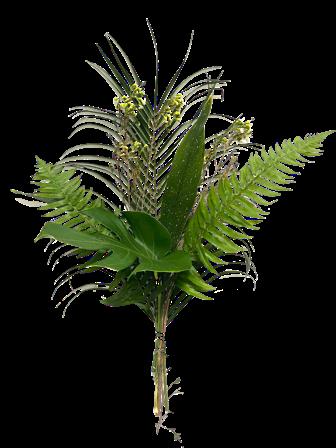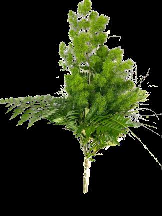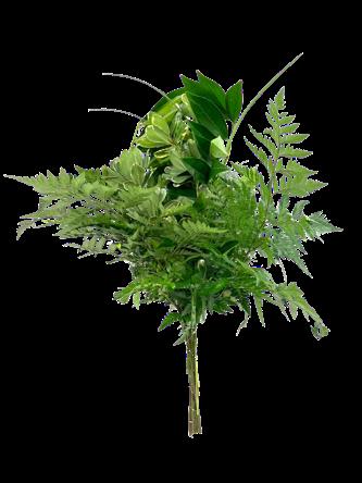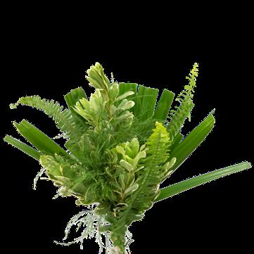 5 Tree Fern, 1 Salal Tip, 1 Cocculus, 5 Green Lilly Grass, 1 Baby Blue & 2 Leather 15 Stems