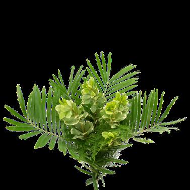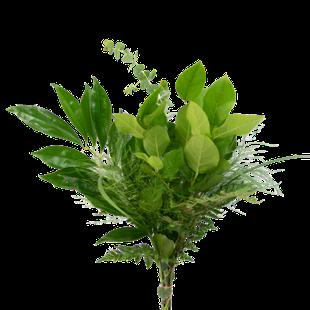 1 Var Pitt, 5 Green Lilly Grass, 2 Cocculus, 3 Plumosa, 5 Leather Leaf & 3 Sword
