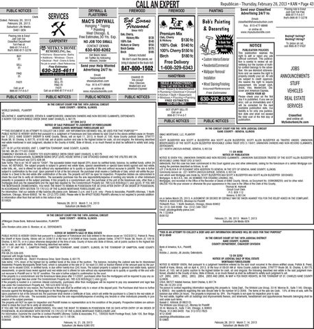 WORLD SAVINGS, PLAINTIFF VS NELONTINE E. KAMPSCHROER; STEVEN R. KAMPSCHROER; UNKNOWN OWNERS AND NON RECORD CLAIMANTS; DEFENDANTS 3 NORTH 725 SOUTH BRIDLE CREEK DRIVE SAINT CHARLES, IL 60175 07 CHK 2412 NOTICE OF SALE PURSUANT TO JUDGMENT OF FORECLOSURE UNDER ILLINOIS MORTGAGE FORECLOSURE ACT ***THIS DOCUMENT IS AN ATTEMPT TO COLLECT ON A DEBT. ANY INFORMATION OBTAINED WILL BE USED FOR THAT PURPOSE*** PUBLIC NOTICE IS HEREBY GIVEN that pursuant to a Judgment of Foreclosure and Sale entered by said Court in the above entitled cause on November 7, 2012, KANE COUNTY SHERIFF in KANE County, Illinois, will on April 11, 2013, in Room JC 100, Kane County Judicial Center, 37W777 Route 38, St. Charles, IL 60175, at 9:00 AM, sell at public auction and sale to the highest bidder for cash, all and singular, the following described real estate mentioned in said Judgment, situated in the County of KANE, State of Illinois, or so much thereof as shall be sufficient to satisfy said Judgment: LOT 16 OF LA FOX WOODS, UNIT 1, CAMPTON TOWNSHIP, KANE COUNTY, ILLINOIS. TAX NO. 08-26-177-001-0000 COMMONLY KNOWN AS: 3 NORTH 725 SOUTH BRIDLE CREEK DRIVE SAINT CHARLES, IL 60175 Description of Improvements: ALUMINUM SIDING SPLIT LEVEL HOUSE WITHA 2 CAR ATTACHED GARAGE AND THE UTILITES ARE ON. The Judgment amount was $372,428.08. Sale Terms: This is an "AS IS" sale for "CASH". The successful bidder must deposit 25% down by certified funds; balance, by certified funds, within 24 hours. NO REFUNDS. The subject property is subject to general real estate taxes, special assessments or special taxes levied against said real estate, water bills, etc., and is offered for sale without any representation as to quality or quantity of title and without recourse to plaintiff. The sale is further subject to confirmation by the court. Upon payment in full of the bid amount, the purchaser shall receive a Certificate of Sale, which will entitle the purchaser to a Deed to the real estate after confirmation of the sale. The property will NOT be open for inspection. Prospective bidders are admonished to check the court file to verify all information. The successful purchaser has the sole responsibility/expense of evicting any tenants or other individuals presently in possession of the subject premises. If this property is a condominium unit, the purchaser of the unit at the foreclosure sale, other than a mortgagee shall pay the assessments and the legal fees required by The Condominium Property Act, 765 ILCS 605/9(g)(1) and (g)(4). IF YOU ARE THE MORTGAGOR (HOMEOWNER), YOU HAVE THE RIGHT TO REMAIN IN POSSESSION FOR 30 DYAS AFTER ENTRY OF AN ORDER OF POSSESSION, IN ACCORDANCE WITH SECTION 15-1701(C) OF THE ILLINOIS MORTGAGE FORECLOSURE LAW. For Information: Visit our website at http:\\service.atty-pierce.com. Between 3 p.m. and 5 p.m. only - Pierce & Associates, Plaintiff's Attorneys, 1 North Dearborn, Chicago, Illinois 60602. Tel. No. (312) 372-2060. Please refer to file #PA0716383 Plaintiff's attorney is not required to provide additional information other than that set forth in this notice of sale. I510620 February 28, 2013 March 7, 14, 2013 Suburban Life Media STC IN THE CIRCUIT COURT FOR THE 16TH JUDICIAL CIRCUIT KANE COUNTY - GENEVA, ILLINOIS JPMorgan Chase Bank, National Association, PLAINTIFF Vs. John Riordan a/k/a John G. Riordan; et. al., DEFENDANTS 11 CH 02229 NOTICE OF SHERIFF'S SALE OF REAL ESTATE PUBLIC NOTICE IS HEREBY GIVEN that pursuant to a Judgment of Foreclosure and Sale entered in the above cause on 10/23/2012, Patrick B. Perez, the Sheriff of Kane County, Illinois will on 3/28/13 at the hour of 9:00AM at Kane County Judicial Center, 37W777 Route 38, Room JC 100 St. Charles, IL 60175, or in a place otherwise designated at the time of sale, County of Kane and State of Illinois, sell at public auction to the highest bidder for cash, as set forth below, the following described real estate: LOT 17 OF UNIT NO. 1, CAMPTON PINES, CAMPTON TOWNSHIP, KANE COUNTY, ILLINOIS, IN THE TOWNSHIP OF CAMPTON, KANE COUNTY, ILLINOIS. PIN 08-25-328-005 Improved with Single Family Home COMMONLY KNOWN AS: 3N307 Ponderosa Drive, Saint Charles, IL 60175 Sale terms: 10% down of the highest bid by certified funds at the close of the auction; The balance, including the Judicial sale fee for Abandoned Residential Property Municipality Relief Fund, which is calculated at the rate of $1 for each $1,000 or fraction thereof of the amount paid by the purchaser not to exceed $300, in certified funds, is due within twenty-four (24) hours. The subject property is subject to general real estate taxes, special assessments, or special taxes levied against said real estate and is offered for sale without any representation as to quality or quantity of title and without recourse to Plaintiff and in "AS IS" condition. The sale is further subject to confirmation by the court. If the property is a condominium and the foreclosure takes place after 1/1/2007, purchasers other than the mortgagees will be required to pay any assessment and legal fees due under The Condominium Property Act, 765 ILCS 605/9(g)(1) and (g)(4). If the property is located in a common interest community, purchasers other than mortgagees will be required to pay any assessment and legal fees due under the Condominium Property Act, 765 ILCS 605/18.5(g-1). If the sale is set aside for any reason, the Purchaser at the sale shall be entitled only to a return of the deposit paid. The Purchaser shall have no further recourse against the Mortgagor, the Mortgagee or the Mortgagee's attorney. Upon payment in full of the amount bid, the purchaser shall receive a Certificate of Sale, which will entitle the purchaser to a Deed to the real estate after Confirmation of the sale. The successful purchaser has the sole responsibility/expense of evicting any tenants or other individuals presently in possession of the subject premises. The property will NOT be open for inspection and Plaintiff makes no represent