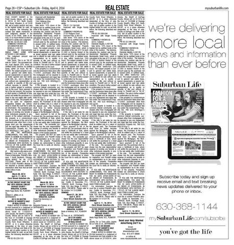 REAL ESTATE y County Farm Road Wheaton, IL 60187, or in a place otherwise designated at the time of sale, County of DuPage and State of Illinois, sell at public auction to the highest bidder for cash, as set forth below, the following described real estate: PIN 02-26-308-006 Improved with Single Family Home COMMONLY KNOWN AS: 433 E. Fullerton Glendale Heights, IL 60139 Sale terms: 10% down of the highest bid by certified funds at the close of the auction; The balance, including the Judicial sale fee for Abandoned Residential Property Municipality Relief Fund, which is calculated at the rate of $1 for each $1,000 or fraction thereof of the amount paid by the purchaser not to exceed $300, in certified funds, is due within twenty-four (24) hours. The subject property is subject to general real estate taxes, special assessments, or special taxes levied against said real estate and is offered for sale without any representation as to quality or quantity of title and without recourse to Plaintiff and in "AS IS" condition. The sale is further subject to confirmation by the court. If the property is a condominium and the foreclosure takes place after 1/1/2007, purchasers other than the mortgagees will be required to pay any assessment and legal fees due under The Condominium Property Act, 765 ILCS 605/9(g)(1) and (g)(4). If the property is located in a common interest community, purchasers other than mortgagees will be required to pay any assessment and legal fees due under the Condominium Property Act, 765 ILCS 605/18.5(g-1). If the sale is set aside for any reason, the Purchaser at the sale shall be entitled only to a return of the deposit paid. The Purchaser shall have no further recourse against the Mortgagor, the Mortgagee or the Mortgagee's attorney. Upon payment in full of the amount bid, the purchaser shall receive a Certificate of Sale, which will entitle the purchaser to a Deed to the real estate after Confirmation of the sale. The successful purchaser has the sole responsibility/ expense of evicting any tenants or other individuals presently in possession of the subject premises. The property will NOT be open for inspection and Plaintiff makes no representation as to the condition of the property. Prospective bidders are admonished to check the Court file to verify all information. IF YOU ARE THE MORTGAGOR (HOMEOWNER), YOU HAVE THE RIGHT TO REMAIN IN POSSESSION FOR 30 DAYS AFTER ENTRY OF AN ORDER OF POSSESSION, IN ACCORDANCE WITH SECTION 151701(C) OF THE ILLINOIS MORTGAGE FORECLOSURE LAW. For information: Examine the court file or contact Plaintiff's attorney: Codilis & Associates, P.C., 15W030 North Frontage Road, Suite 100, Burr Ridge, IL 60527, (630) 794-9876. Please refer to file number 14-13-23176. I598585 April 4, 11, 18, 2014 Carol Stream Suburban Life IN THE CIRCUIT COURT FOR THE 18TH JUDICIAL CIRCUIT DUPAGE COUNTY WHEATON, ILLINOIS Wells Fargo Bank, N.A., PLAINTIFF Vs. Jacinto De La Torre a/k/a Jasinto De La Torre; et. al., DEFENDANTS 2013 CH 000465 NOTICE OF SHERIFF'S SALE OF REAL ESTATE PUBLIC NOTICE IS HEREBY GIVEN that pursuant to a Judgment of Foreclosure and Sale entered in the above cause on 2/10/2014, John