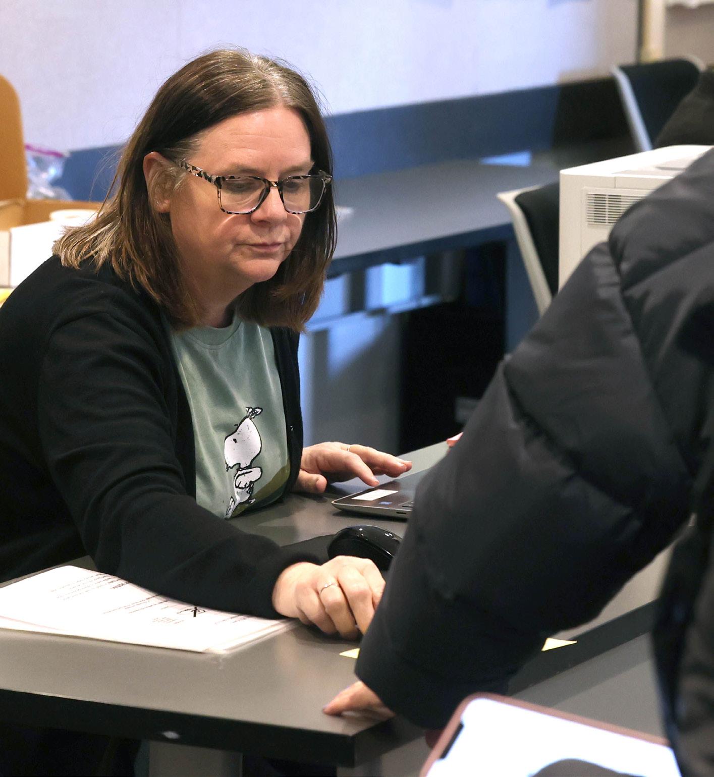 Election judge Terrilynn Morris checks in voters for the primary election March 17, at the DeKalb County Administration Building in Sycamore.