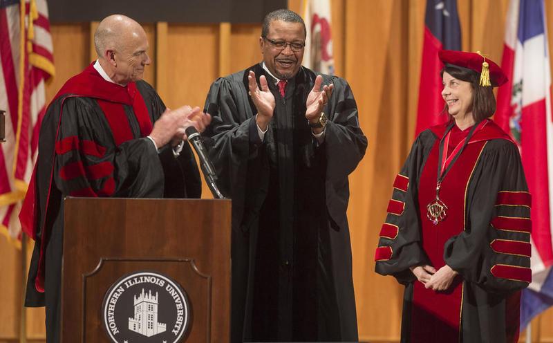 Board of Trustees Chair Dennis Barsema (left) and former chair Wheeler Coleman applaud Northern Illinois University President Lisa C. Freeman during her installation ceremony on April 7, 2019, in the Boutell Memorial Concert Hall in the NIU Music Building.