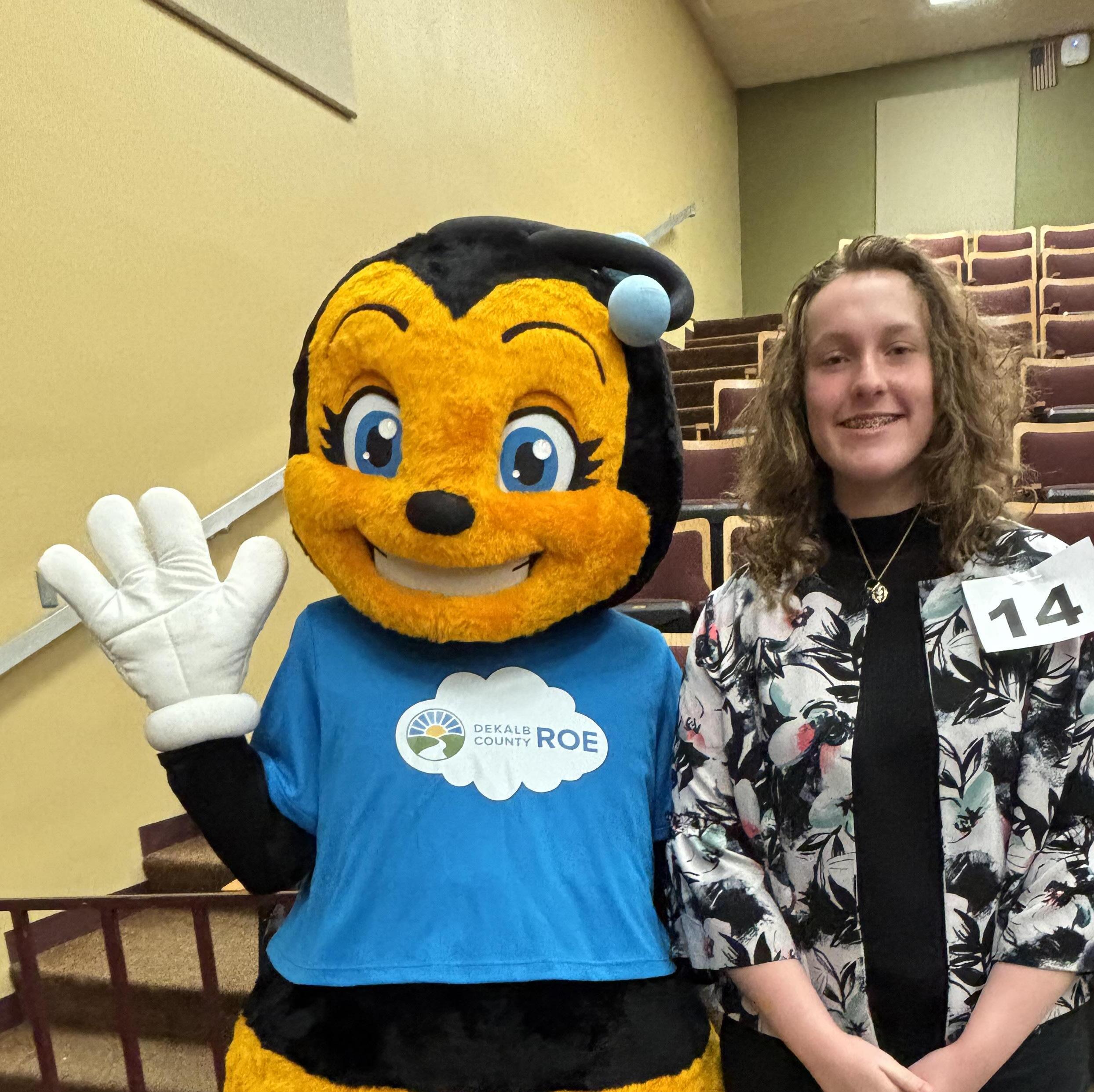 Brighid Reid stands with a DeKalb County Regional Office of Education spelling bee mascot at Sycamore High School on Feb. 21.