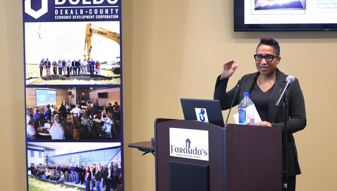 Renee Wott, with the Illinois Department of Commerce and Economic Opportunity, speaks March 25 during the DeKalb County Economic Development Corp.’s annual economic outlook luncheon at Faranda’s Banquets in DeKalb.