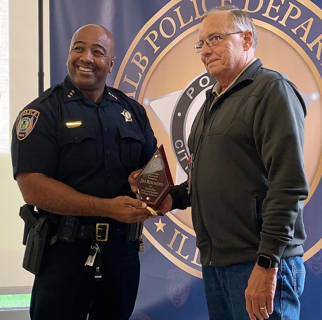 Photo provided by the DeKalb County Community Foundation DeKalb Police Department chief David Byrd (left) honors Jim Rhoades for 50 years of service.