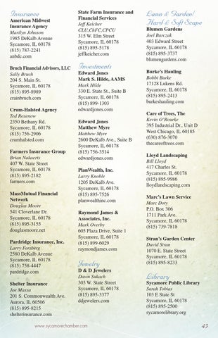 Lawn & Garden/ Hard & Soft Scape Blumen Gardens Joel Barczak 403 Edward Street Sycamore, IL 60178 (815) 895-3737 blumengardens.com Burke’s Hauling Bobbi Burke 17128 Lukens Rd. Sycamore, IL 60178 (815) 895-2413 burkeshauling.com Care of Trees, The Kevin O’Rourke 395 Industrial Dr., Unit D West Chicago, IL 60185 (630) 876-3070 thecareoftrees.com Lloyd Landscaping Bill Lloyd 417 Charles St. Sycamore, IL 60178 (815) 895-9986 lloydlandscaping.com Marc’s Lawn Service Marc Doty P.O. Box 306 1711 Park Ave. Sycamore, IL 60178 (815) 739-7818 Stran’s Garden Center David Stran 1070 E. State Street Sycamore, IL 60178 (815) 895-8233