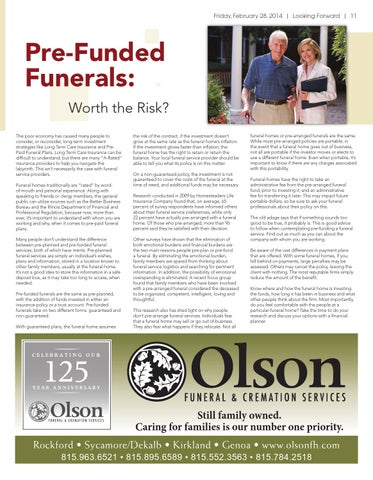 Pre-Funded Funerals: Worth the Risk? The poor economy has caused many people to consider, or reconsider, long-term investment strategies like Long Term Care Insurance and PrePaid Funeral Plans. Long Term Care Insurance can be difficult to understand, but there are many “A-Rated� insurance providers to help you navigate the labyrinth. This isn’t necessarily the case with funeral service providers. Funeral homes traditionally are “rated� by wordof-mouth and personal experience. Along with speaking to friends or clergy members, the general public can utilize sources such as the Better Business Bureau and the Illinois Department of Financial and Professional Regulation, because now, more than ever, it’s important to understand with whom you are working and why, when it comes to pre-paid funeral plans. Many people don’t understand the difference between pre-planned and pre-funded funeral services, both of which have merits. Pre-planned funeral services are simply an individual’s wishes, plans and information, stored in a location known to other family members, usually at the funeral home. It’s not a good idea to store this information in a safe deposit box, as it may take too long to access, when needed. Pre-funded funerals are the same as pre-planned, with the addition of funds invested in either an insurance policy or a trust account. Pre-funded funerals take on two different forms: guaranteed and non-guaranteed. With guaranteed plans, the funeral home assumes