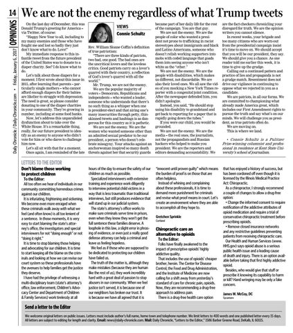 became part of her daily life for the rest of the campaign. You are that guy. We are not the enemy. We are the people of color who wanted a president not prone to trafficking in racist stereotypes about immigrants and black Rev. William Sloane Coffin’s definition and Latino Americans, someone who of true patriotism: doesn’t relish working supporters into “There are three kinds of patriots, mobs with coded language that goads two bad, one good. The bad ones are them into seeing anyone who isn’t the uncritical lovers and the loveless white as the “other.” critics. Good patriots carry on a lover’s We are not the enemy. We are the quarrel with their country, a reflection people with disabilities, which makes of God’s lover’s quarrel with all the us different, not discardable. We are world.” also their loved ones. We all saw the vidMr. Trump, we are not the enemy. eo of you mocking a New York Times reWe are the popular majority of porter with a congenital joint condition. voters – Democrats, Republicans and After the newspaper defended him, you independents – who wanted a leader, didn’t apologize. someone who understands that there’s Instead, you said, “He should stop no such thing as a whisper when one using his disability to grandstand and is president-elect and that airing one’s get back to reporting for a paper that is many insecurities through petty, thinrapidly going down the tubes.” skinned tweets and hashtags is as danIf you were our child, you would be gerous for this country as it is pathetic. grounded. We are not the enemy. We are the We are not the enemy. We are the women who wanted someone other than media – the real ones, the journalists, an admitted sexual predator to be our not the propagandists and Russian president, a person who doesn’t celebrate misogyny. Your attacks against an hackers who helped to make you president. We are the reporters and anchorwoman inspired so many death threats against her that security guards editors demanding accountability. We