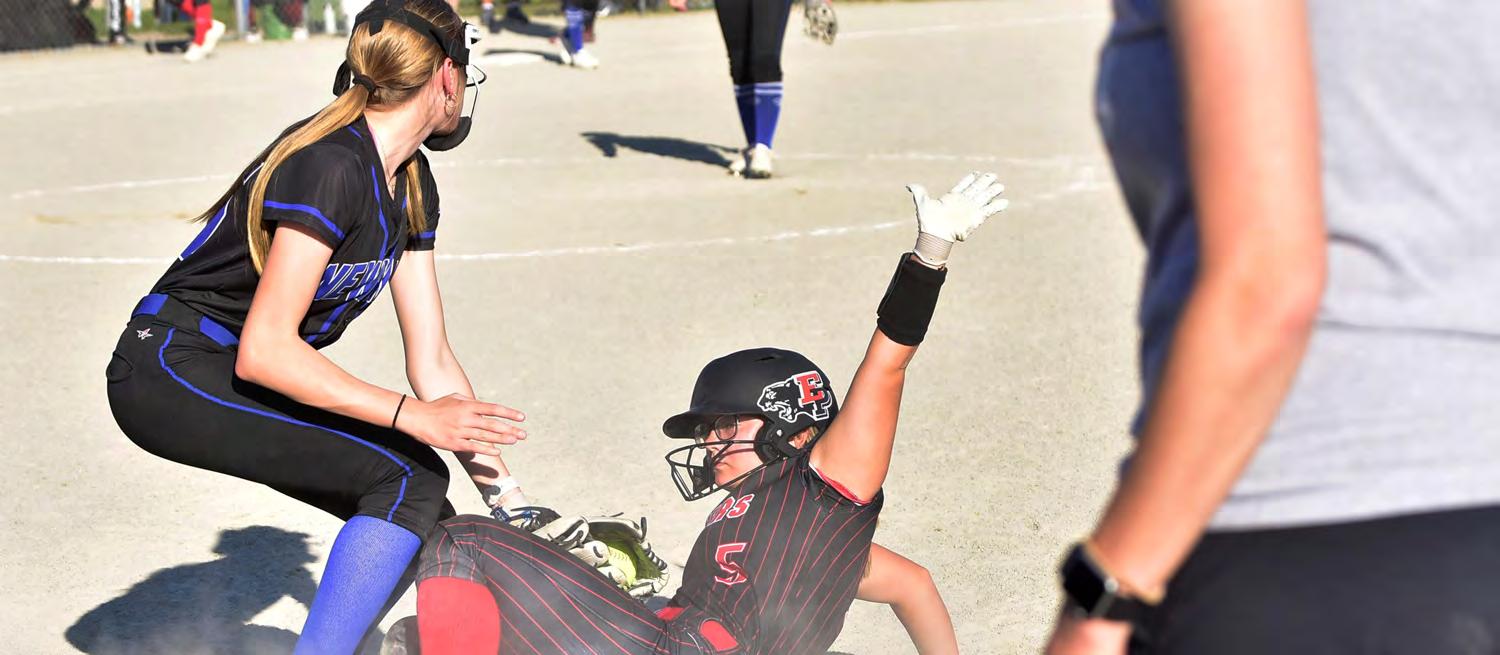 Jaylynn Hamilton slides back to first base safely after beating the tag by Newman’s Claire Von Holten on