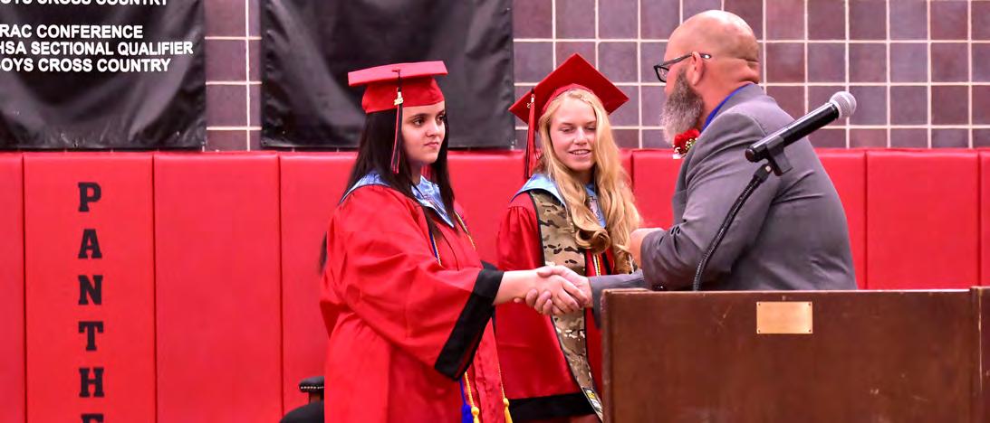 Erie High School Principal Tim McConnell congratulates co-salutatorians Alexis Payne (left) and Lillian McWilliams during the graduation ceremony May 18 at Erie High School.
